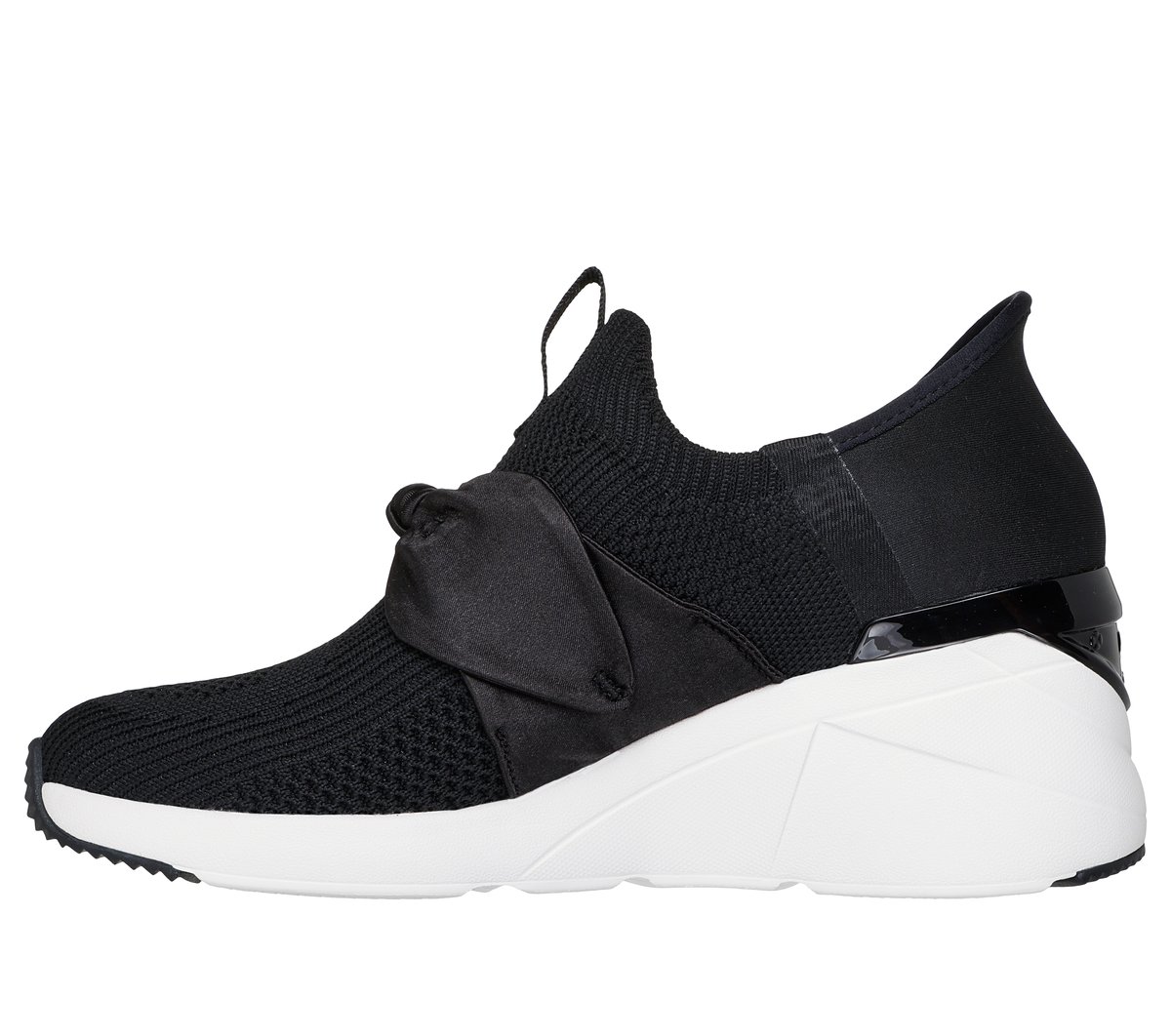 Step out with eye-catching style wearing Skechers Hands Free Slip-ins® Mark Nason®: This high-wedge fashion sneaker features a engineered knit upper with bow front accent, a high-gloss heel clip, Memory Foam Lux insole cushioning, and a color-blocked midsole.