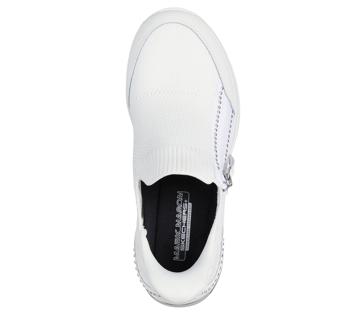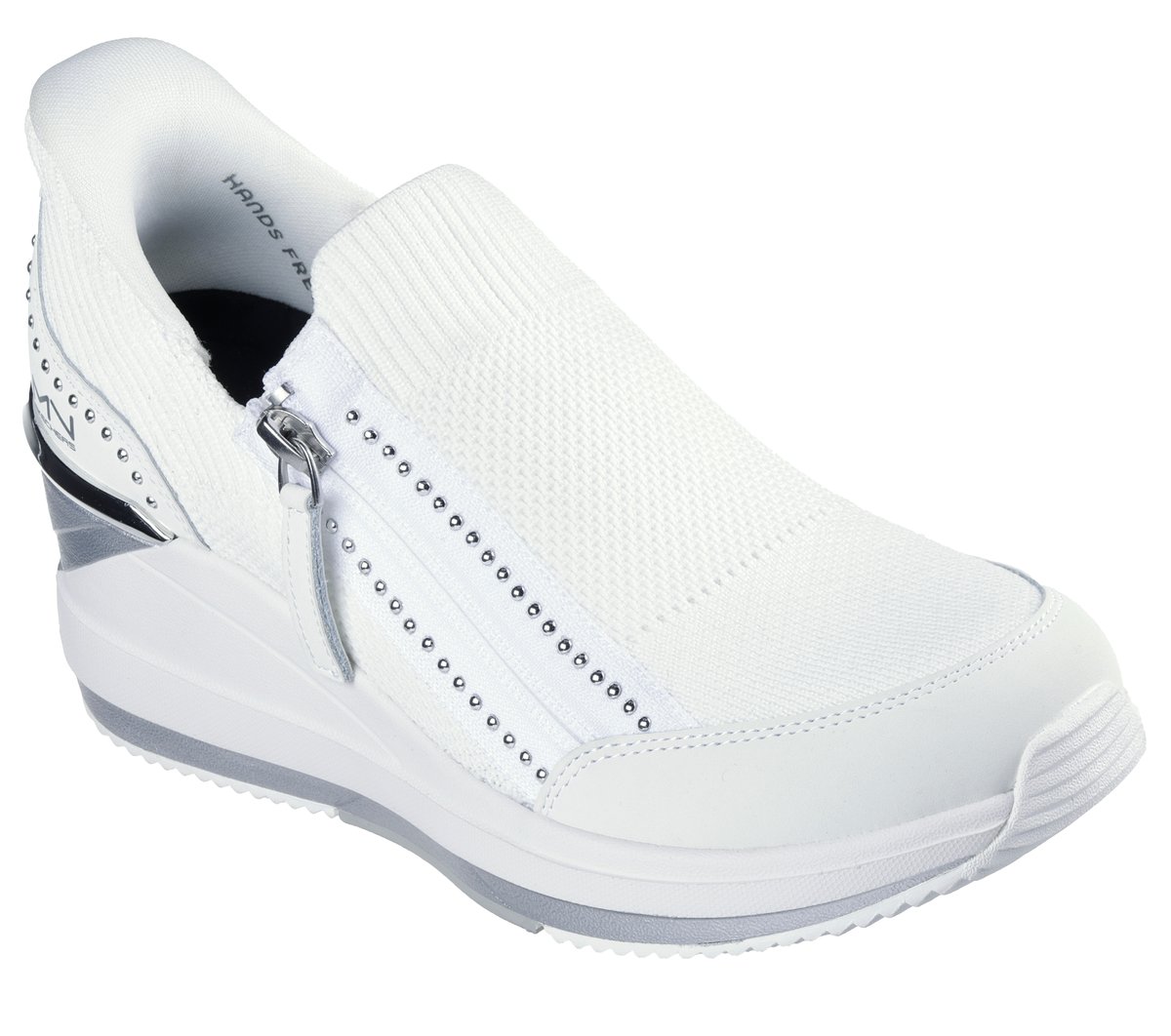 Take your street style to eye-catching new heights wearing Skechers Hands Free Slip-ins® Mark Nason®: The Triple Wedge – Krissie. Designed with our Heel Pillow®, this studded high-wedge fashion sneaker features a knit and leather upper with a side zipper, a high-gloss heel clip, Memory Foam Lux insole cushioning, and a glitter trim midsole.