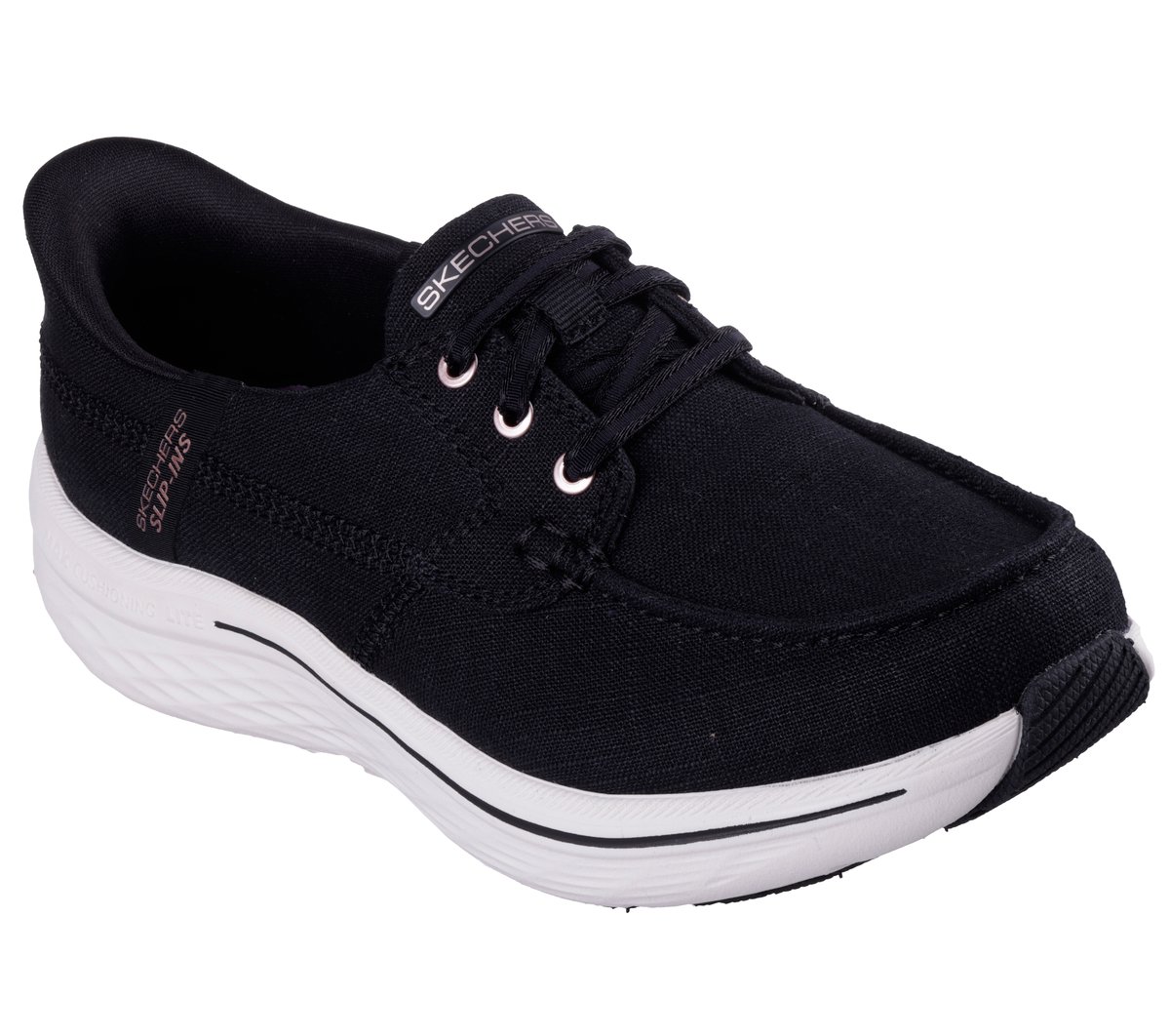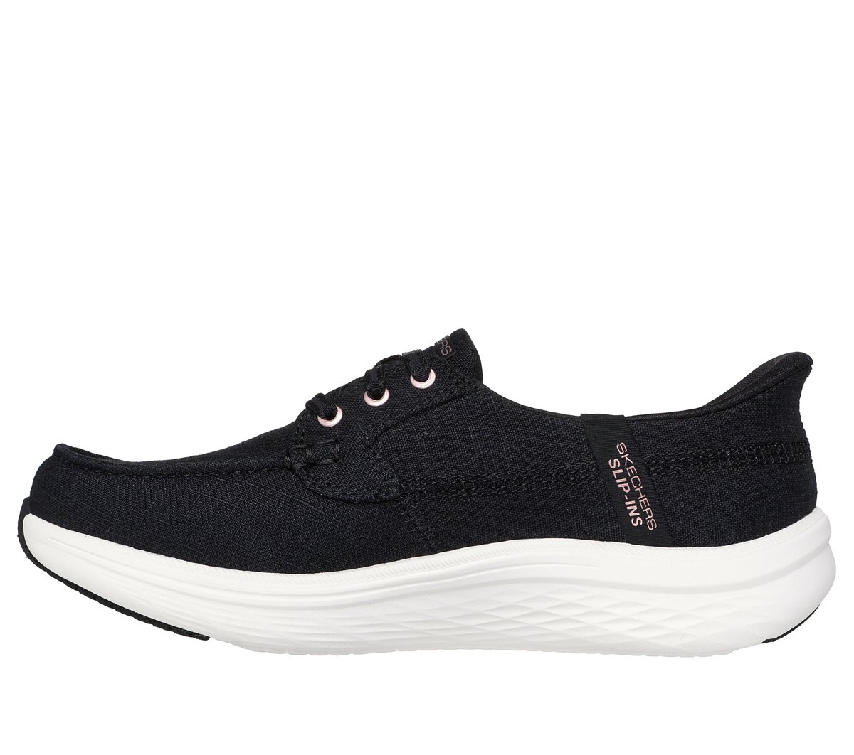 Sail into maximum comfort and sea-worthy style wearing Skechers Hands Free Slip-ins®: Max Cushioning Lite Aura – Corinne. Designed with our Heel Pillow®, this boat-style vegan slip-on features a canvas upper with stretch deco laces, a breathable Skechers Air-Cooled Goga Mat™ insole, and a supportive Max Cushioning™ midsole with responsive ULTRA LIGHT® cushioning.