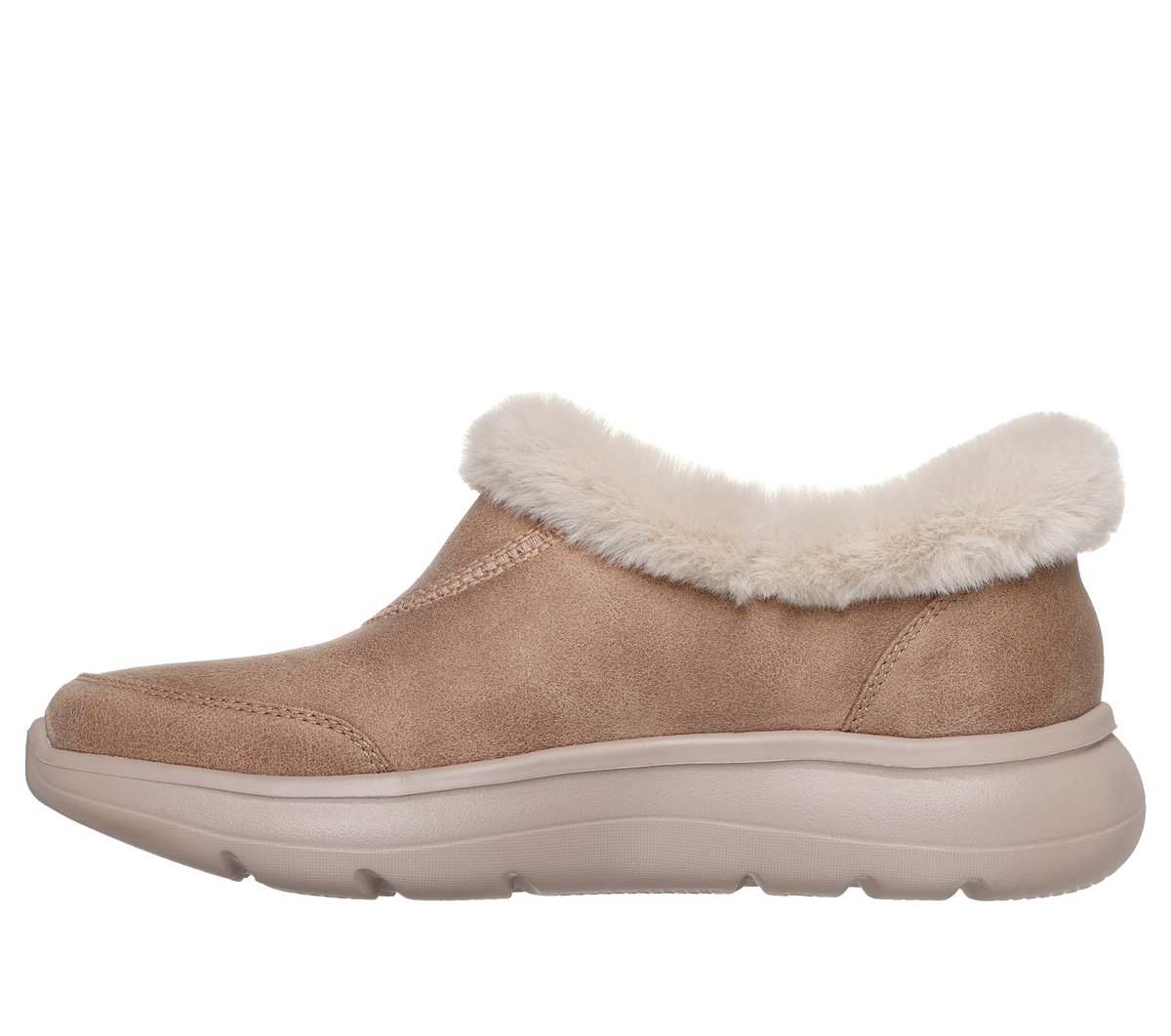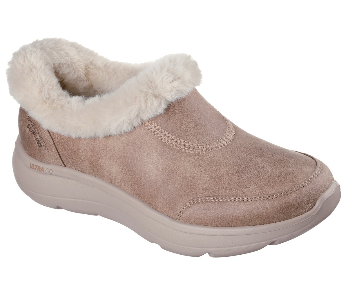 Lounge in effortless style and comfort with Skechers Hands Free Slip-ins®: On-the-GO® Encore – Josie. Designed with our Heel Pillow®, this slip-on lounge bootie features a synthetic leather upper, faux fur trim, a Skechers Air-Cooled Goga Mat™ insole, and lightweight ULTRA GO® cushioning.