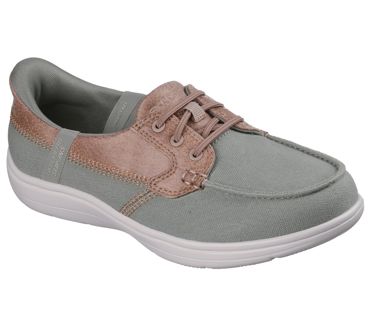 Get on board with the stylish comfort of Skechers On-the-GO® Flex Radiant – Sandy. This casual vegan boat style features a canvas and faux leather upper with fixed stretch laces, high-rebound Skechers Air-Cooled Goga Mat™ insole, and lightweight ULTRA GO® cushioning.