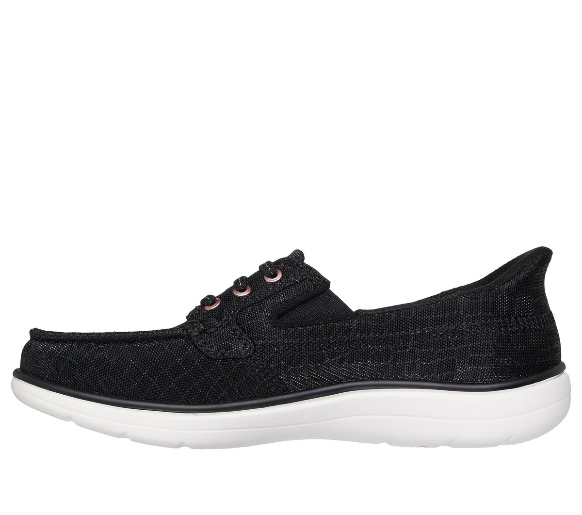 Hit the deck in wild style and comfort with Skechers Hands Free Slip-ins®: On-the-GO® Flex Radiant – Ssstunner. Designed with our Heel Pillow®, this vegan boat design features a snake print woven upper with fixed stretch laces, high-rebound Skechers Air-Cooled Goga Mat™ insole, and lightweight ULTRA GO® cushioning.