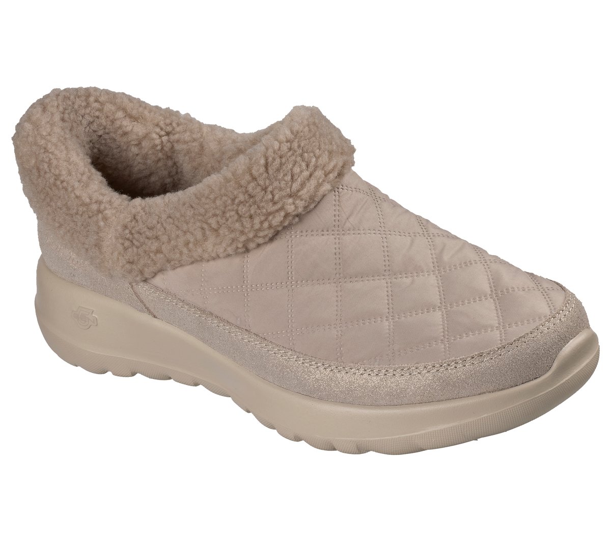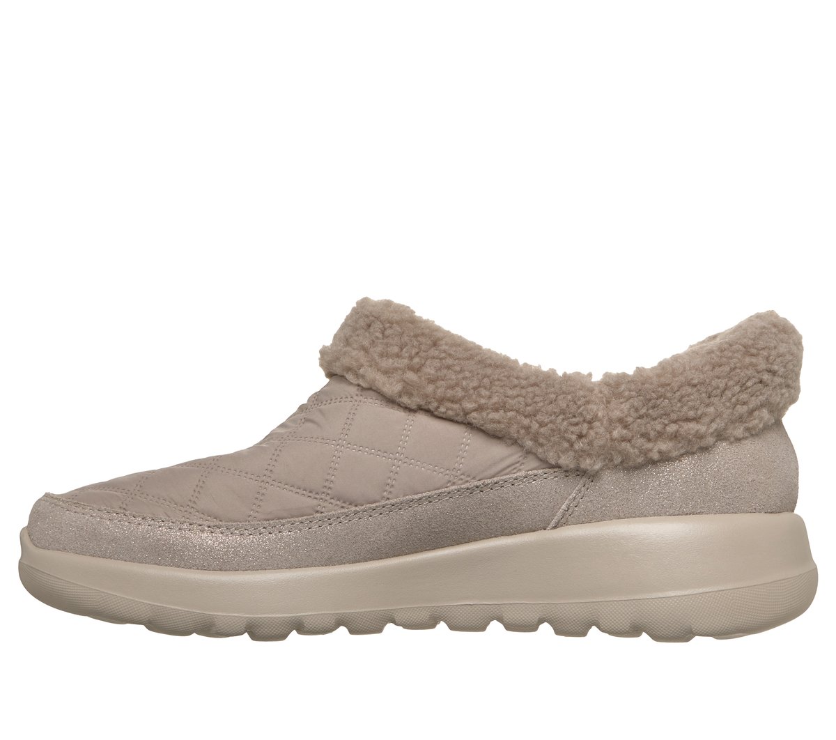 Lounge in luxurious plush comfort with Skechers Hands Free Slip-ins®: On-the-GO® Joy – Cozy Fit® Cara. Designed with our Heel Pillow®, this lounge slipper features an air-quilted Cozy Fit® upper with suede trim, faux sherpa collar, chenille lining, Skechers Air-Cooled Memory Foam®, and lightweight 5GEN® midsole cushioning.