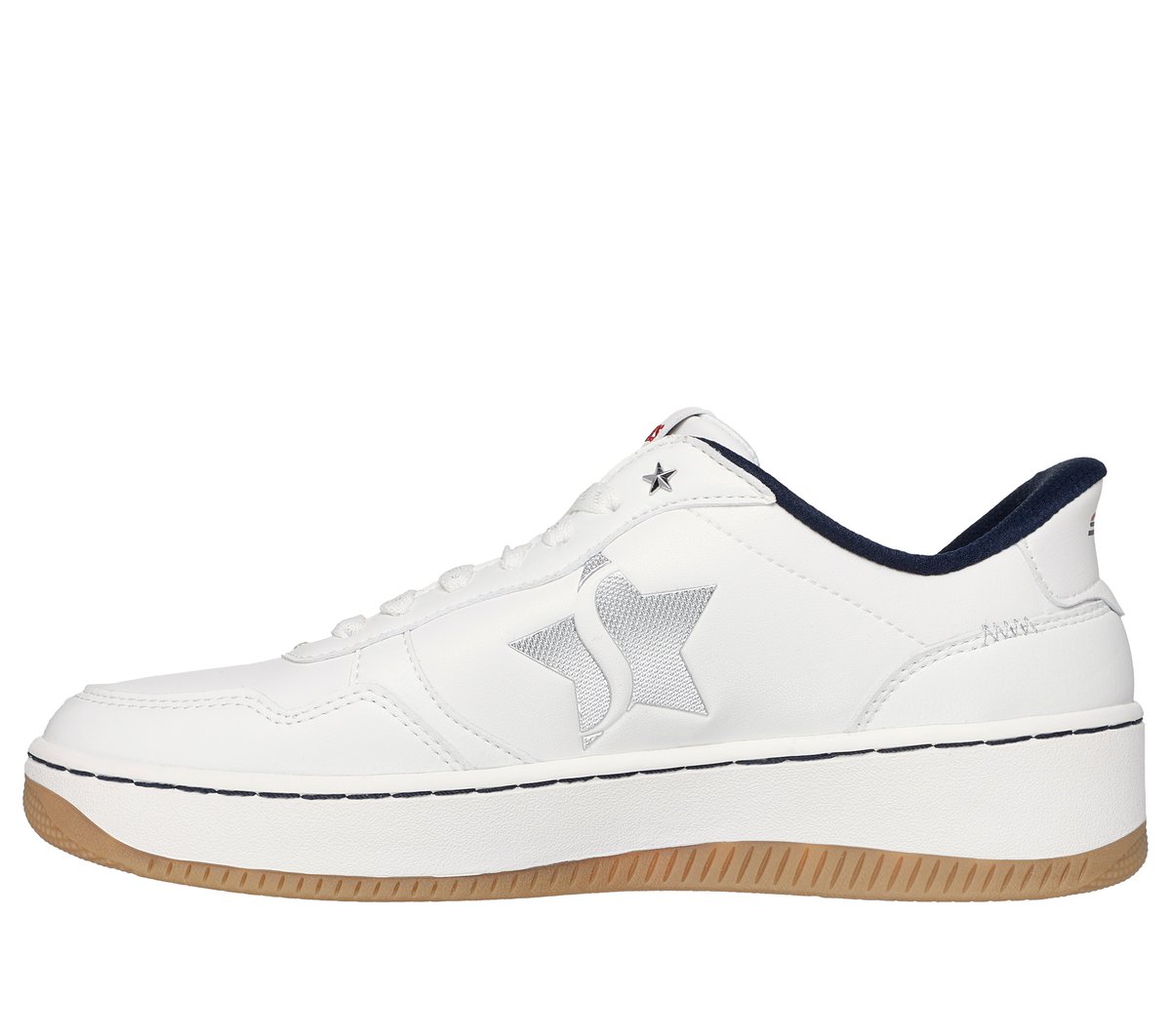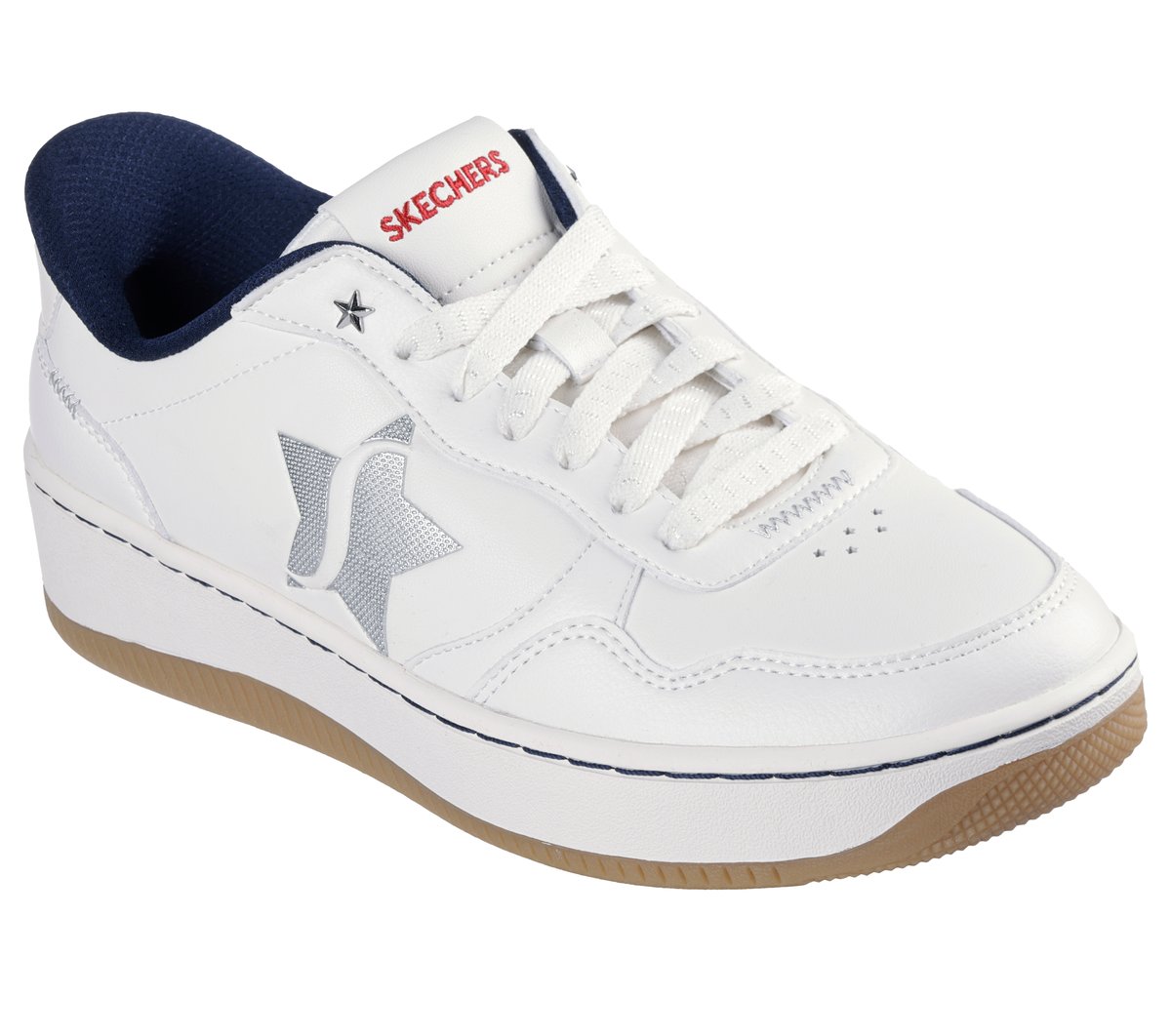 Get that classic court style with easy wearability in Skechers Hands Free Slip-ins®: Sport Court 2.0 – Studded Star. Designed with our Heel Pillow®, this laced slip-on style features a duraleather upper with metallic star detail, a hands-free Skechers Slip-ins® molded heel panel, and a Skechers cushioned Air-Cooled Memory Foam® insole.