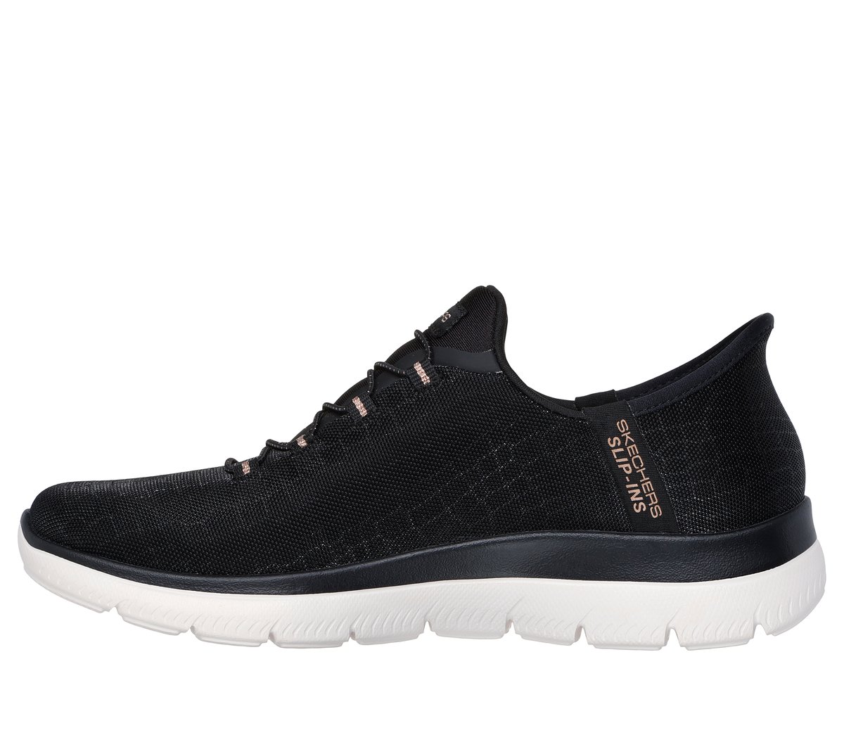 Add a little glam to your step with the effortlessly comfortable Skechers Slip-ins®: Summits – Classy Night. Designed with our Heel Pillow®, this vegan style features a snake patterned sparkle mesh upper with fixed stretch laces and a cushioned Skechers Air-Cooled Memory Foam® comfort insole.
