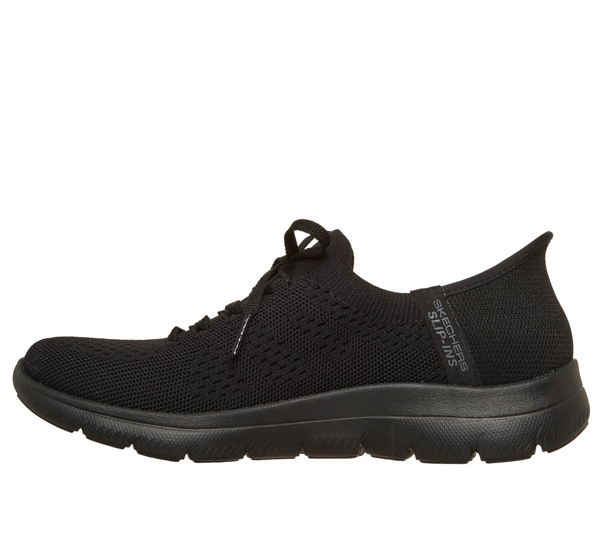 STEP IN AND GO™ Pick up the pace with increased ease-of-wear and platinum comfort wearing Skechers Hands Free Slip-ins®: Summits – New Daily. Designed with our Heel Pillow®, this vegan style features a Stretch Fit® engineered knit upper with fixed laces, metallic midsole trim and a cushioned Skechers Air-Cooled Memory Foam® comfort insole.