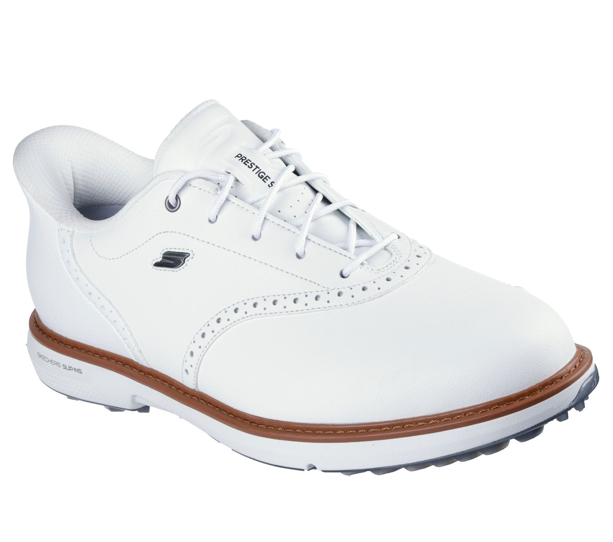 Handle the course with the best in comfort technologies wearing Skechers Hands Free Slip-ins® Waterproof: GO GOLF® Prestige SL. Designed with our Heel Pillow®, this waterproof golf design features a lace-up leather upper with a removable Arch Fit® insole, lightweight ECO FLIGHT™ cushioning, and a spikeless outsole.