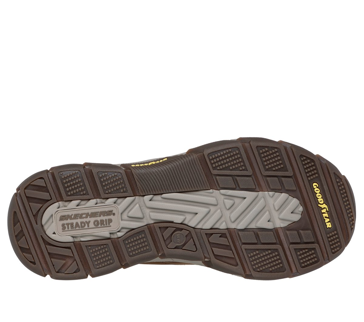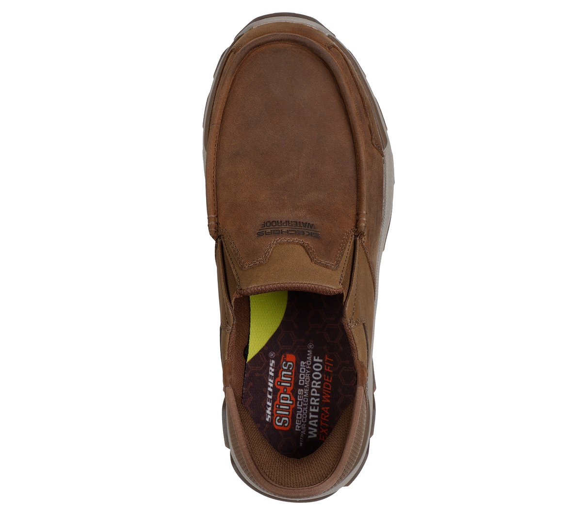 Simply step in and go wearing Skechers Hands Free Slip-ins® Waterproof Relaxed Fit®: Respected – Proximo. Designed with our Heel Pillow®, this roomy waterproof slip-on features a moc toe leather upper with twin gore panels, a charcoal-infused Skechers Air-Cooled Memory Foam® insole, and an anti-slip Goodyear® Rubber Outsole.