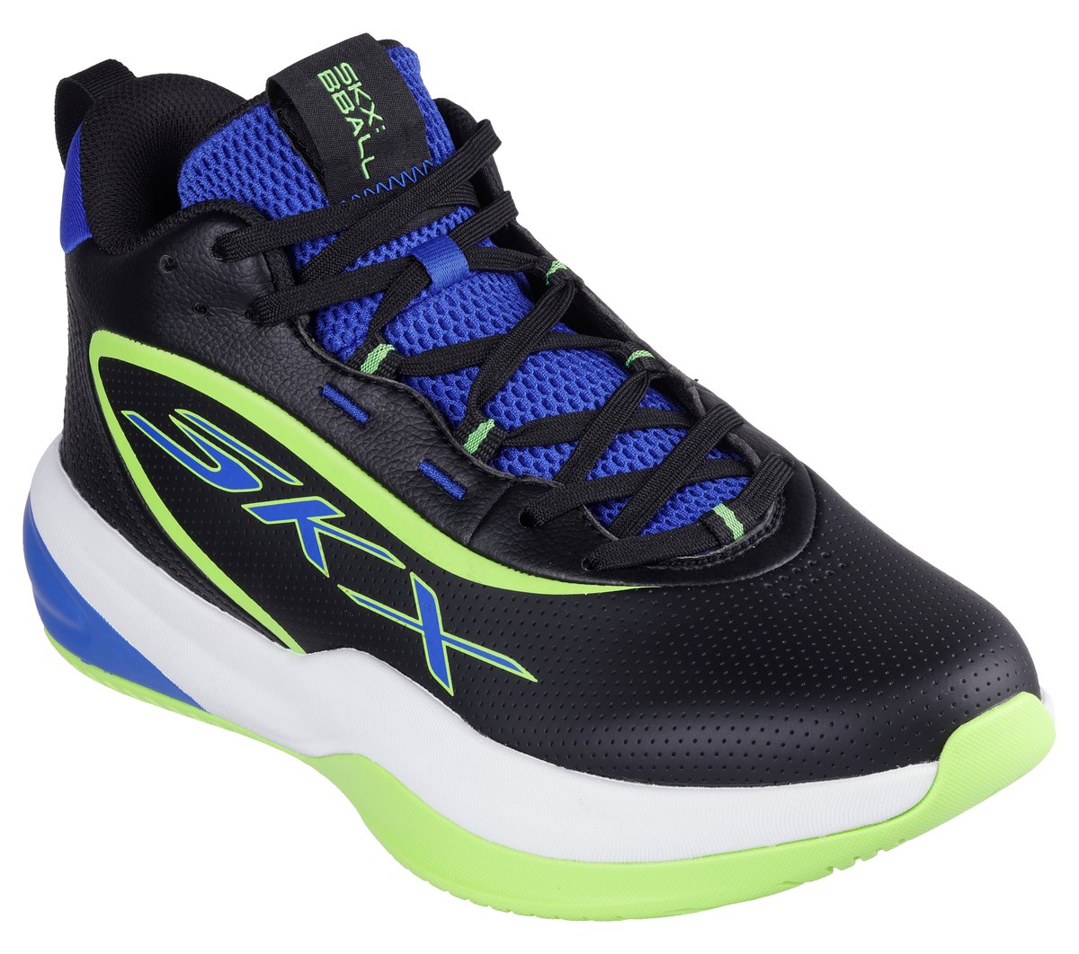 Whether driving to the hoop or locking down defense, you’ll have the winning edge with Skechers Basketball®: SKX League™. This high-top performance court shoe delivers optimal comfort and exceptional stability. A breathable perforated leather upper promotes air flow, while resilient Skechers MOVE FOAM™ insoles and innovative 5-GEN® Foam cushioning respond quickly underfoot.
