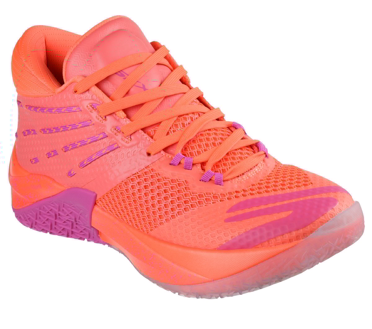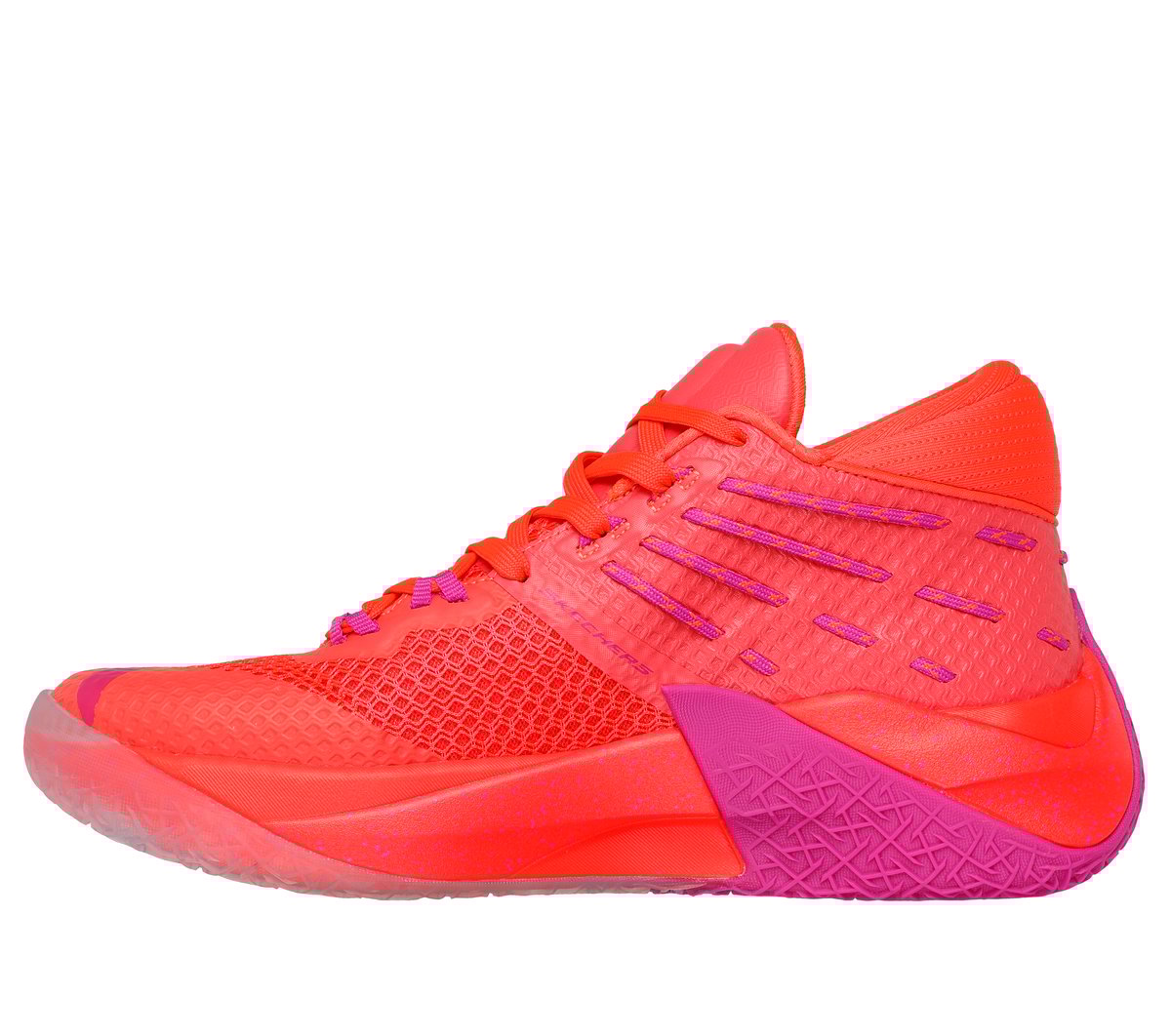 Take your game to the next level with Skechers Basketball®: SKX REIGN™, footwear engineered to promote a quick first step, speed, and intense traction. This mid-top lace-up features a comfort collar, lock-down heel, and a strategically-placed mid-foot wrap for players who prefer more stability. The design is enhanced with a resilient Skechers HYPER BURST PRO™ sock liner, a dual-density Skechers HYPER BURST® midsole, a carbon-infused plate for explosive take-offs, and a Goodyear® Performance Outsole for superior grip and long-lasting durability.