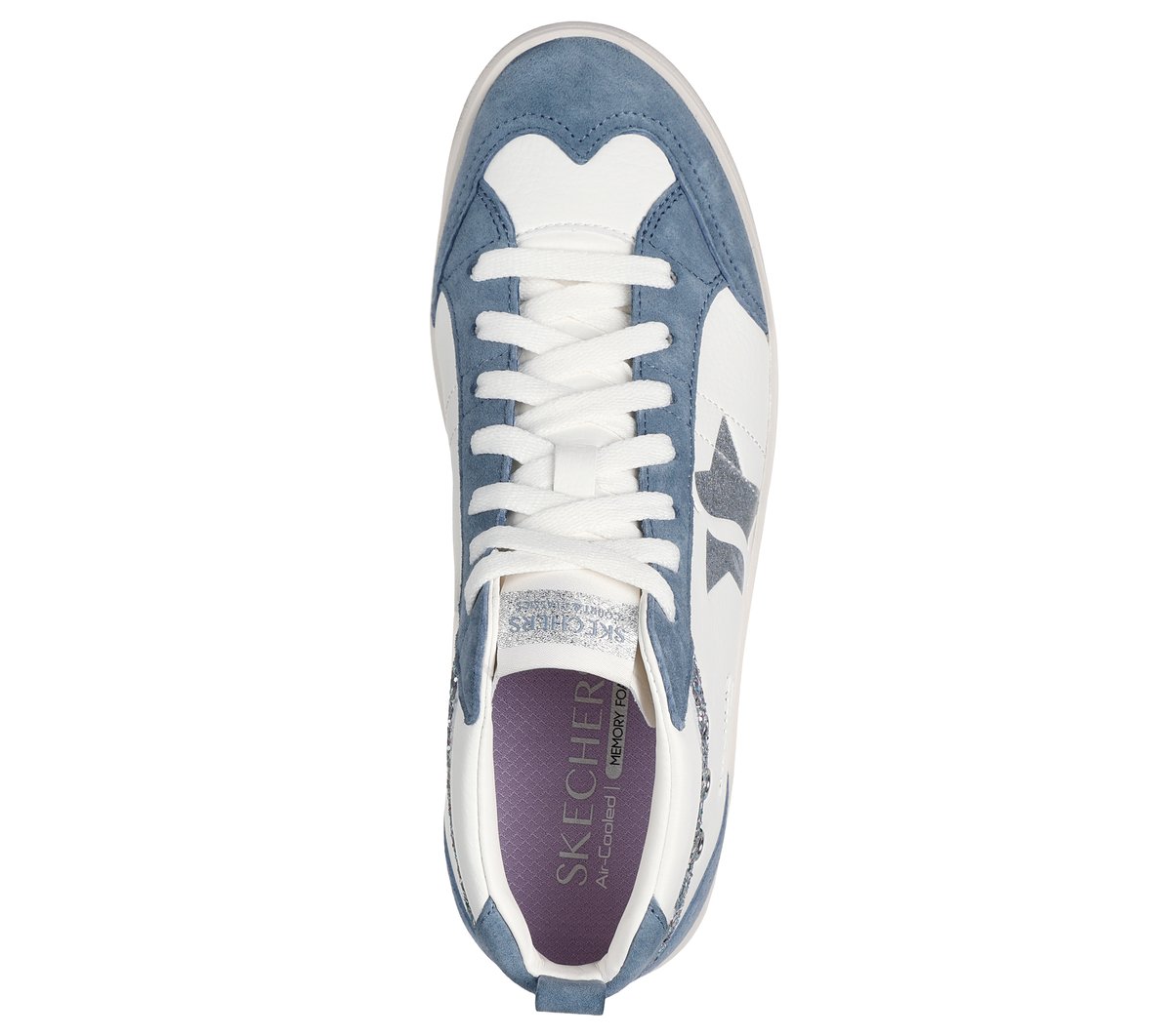 Find your star power style with uncompromising comfort wearing Skechers Strand Star – Radiant Rebel. This mid-top fashion sneaker features a pigskin leather upper with rock glitter trim, a hidden wedge court-style midsole, lace-up front, debossed metallic star, and a Skechers Air-Cooled Memory Foam® cushioned insole.