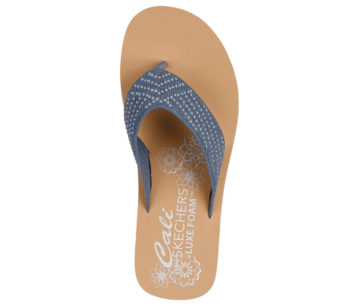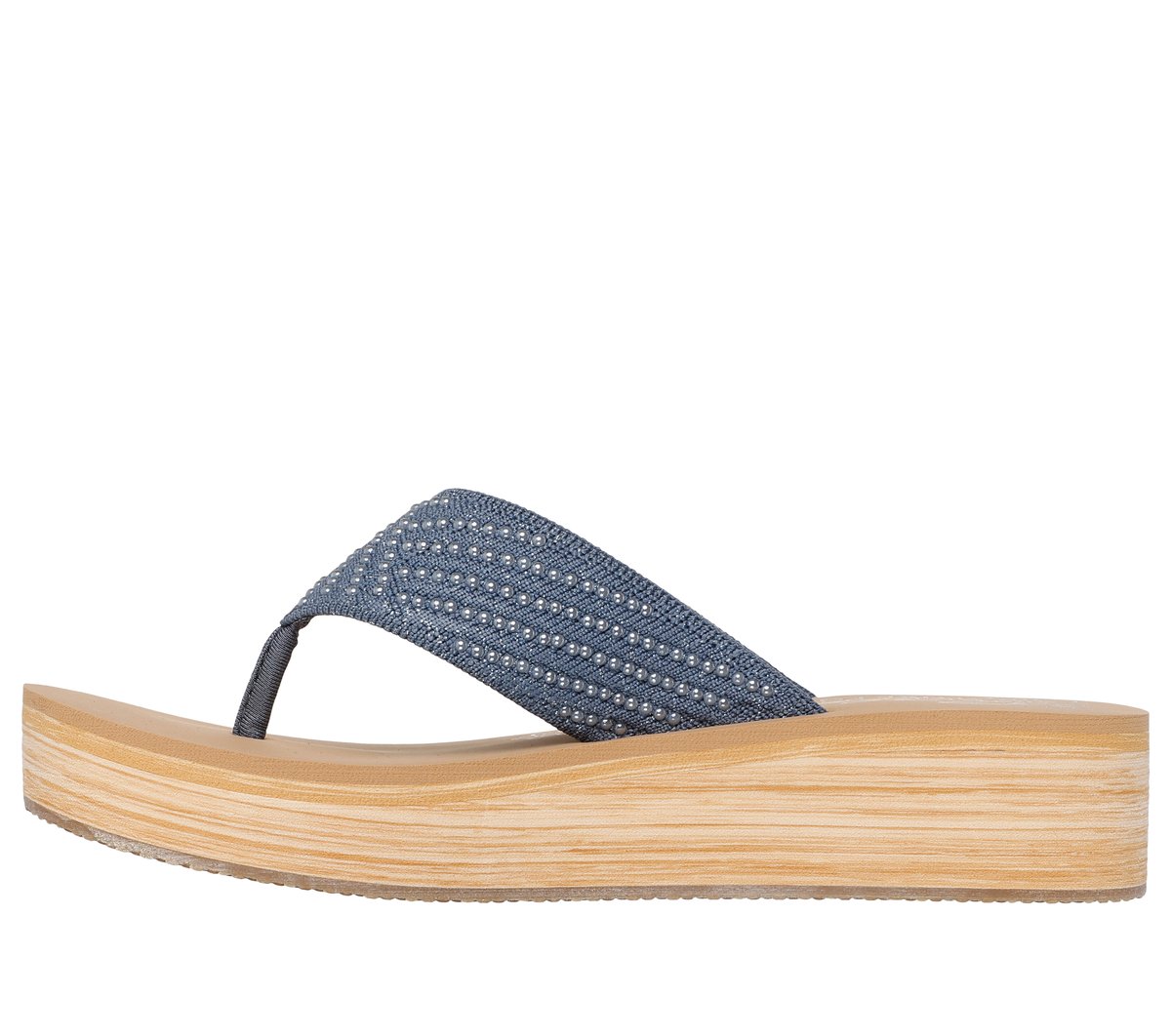 Beachy and breezy is the look wearing Skechers Cali® Summers Mid. This vegan thong sandal features a pearl knit upper with faux wood grain detail on the midsole and a Luxe Foam® cushioned comfort footbed.