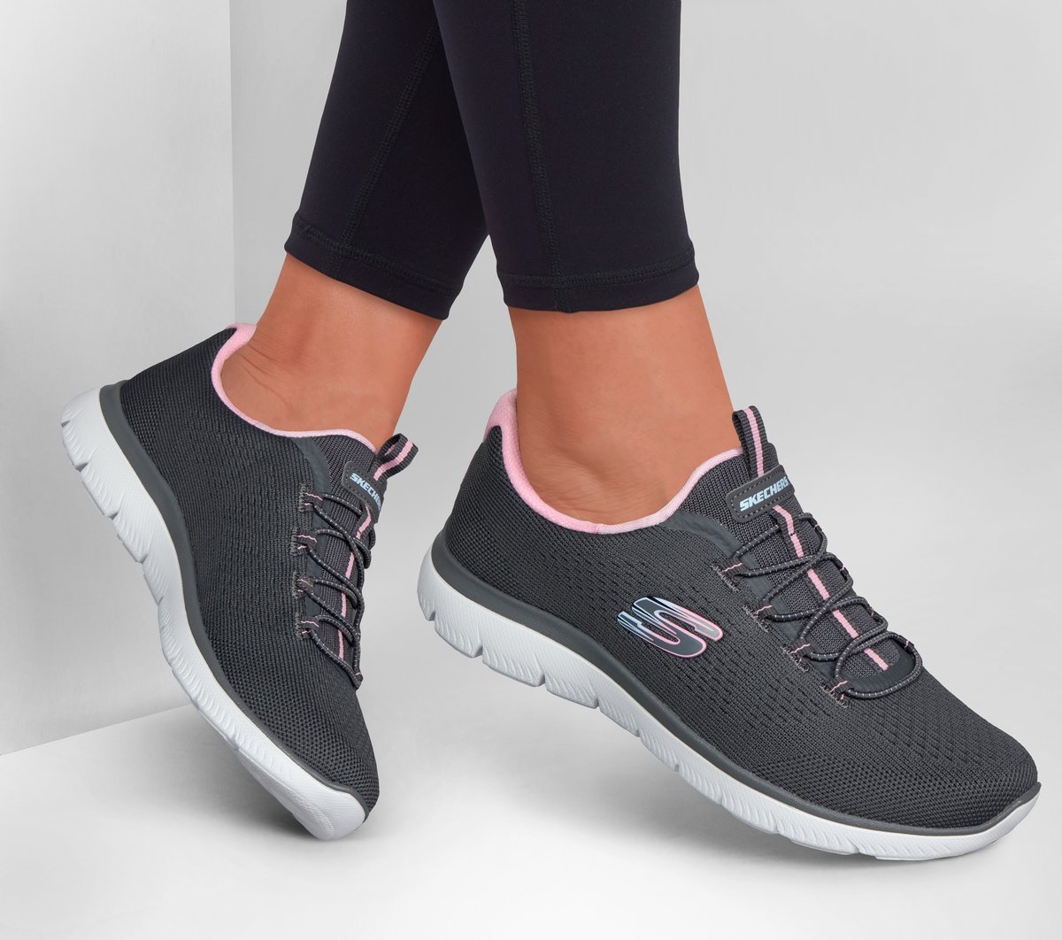Reach the height of comfort and athletic style with Skechers Summits – Radiant Flow. This easy-on vegan design features an engineered knit upper with a stretch-lace front and a Skechers Memory Foam™ cushioned comfort insole.