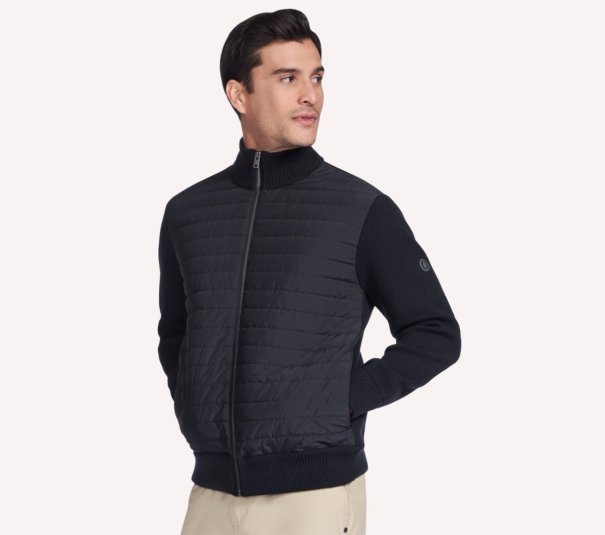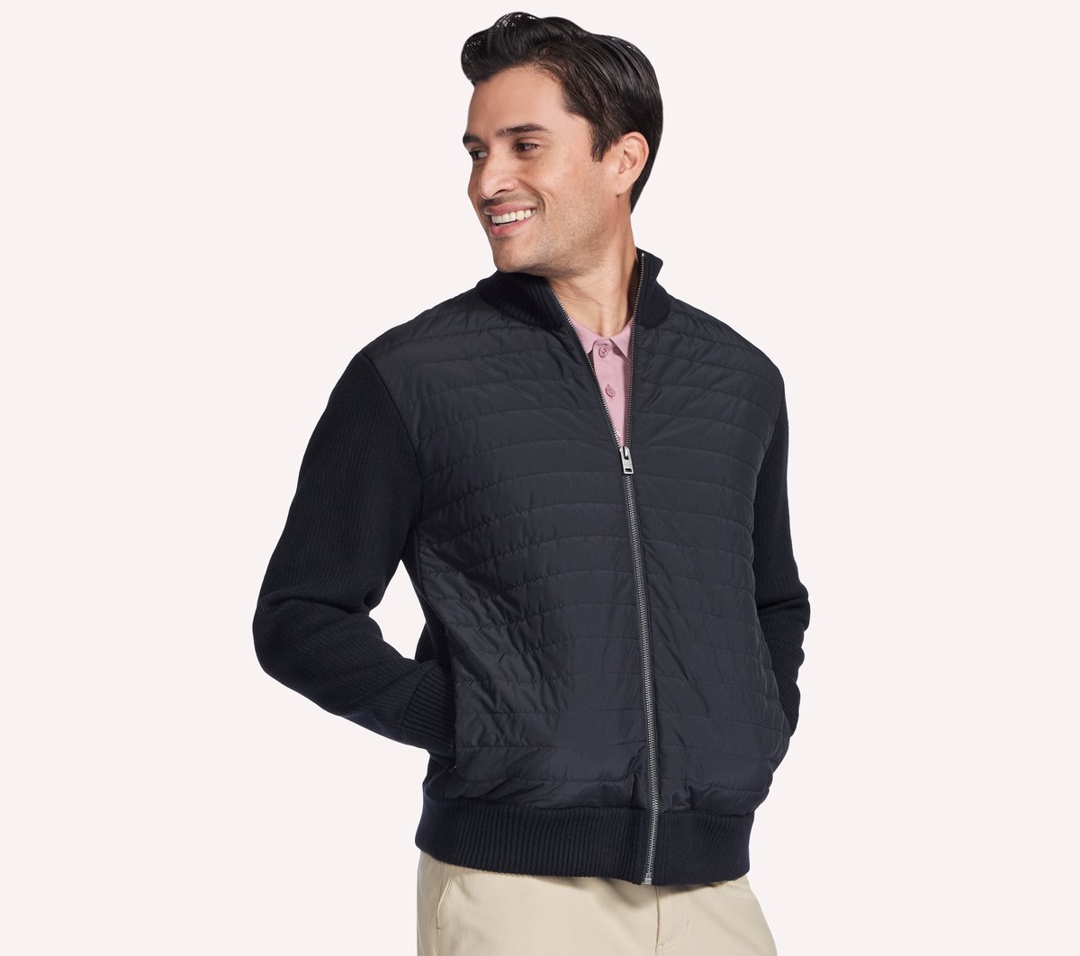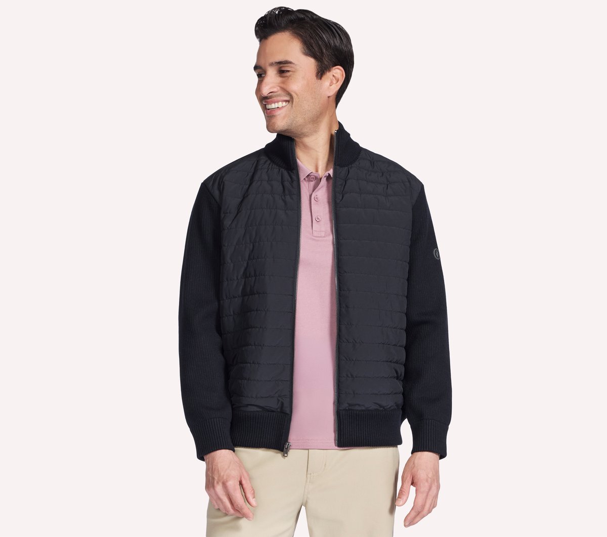 Zip into soft and warm comfort with the Skechers Hoodless Hoodie™ Cozy Fit® Knit Hybrid Jacket. This full-zip hybrid jacket features knit sleeves, back panel, collar, and bottom band with a lightweight GO SHIELD™ Cozy Fit® quilted front panel, plus zipped hand pockets and a Skechers patch logo at left bicep.