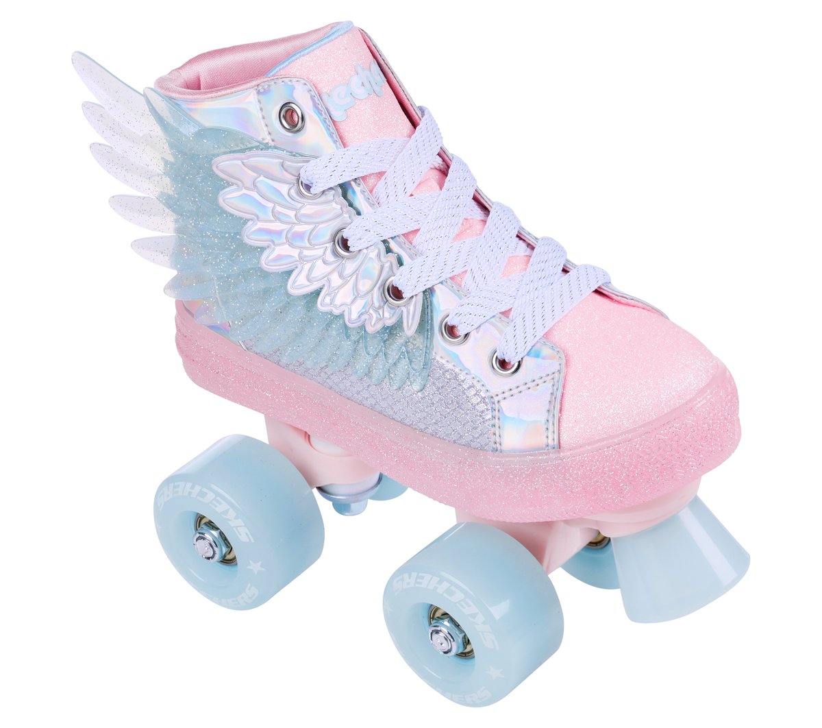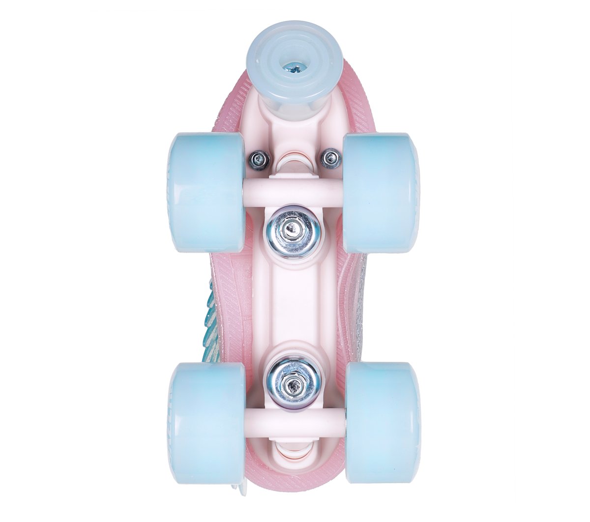 Bring some mystical magic to your roller-skates play wearing Skechers Twinkle Toes® Shuffle 4 Wheeler – Unicorn Soaring. This unicorn themed roller-skates lace-up sneaker features a glittery synthetic upper with iridescent trim, unicorn wings along the sides, complete with urethane skate wheels and front toe stopper.