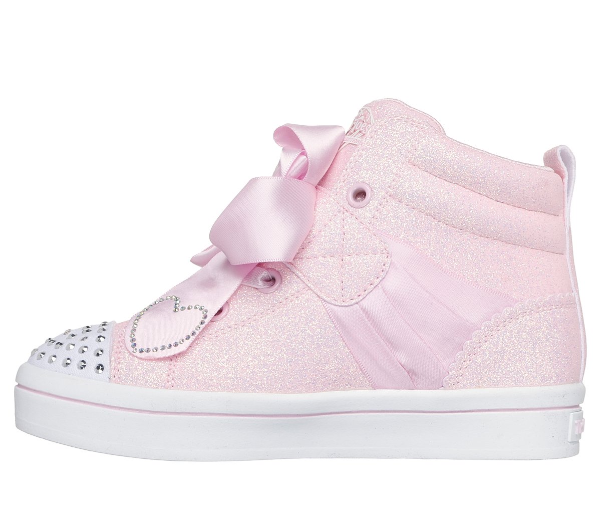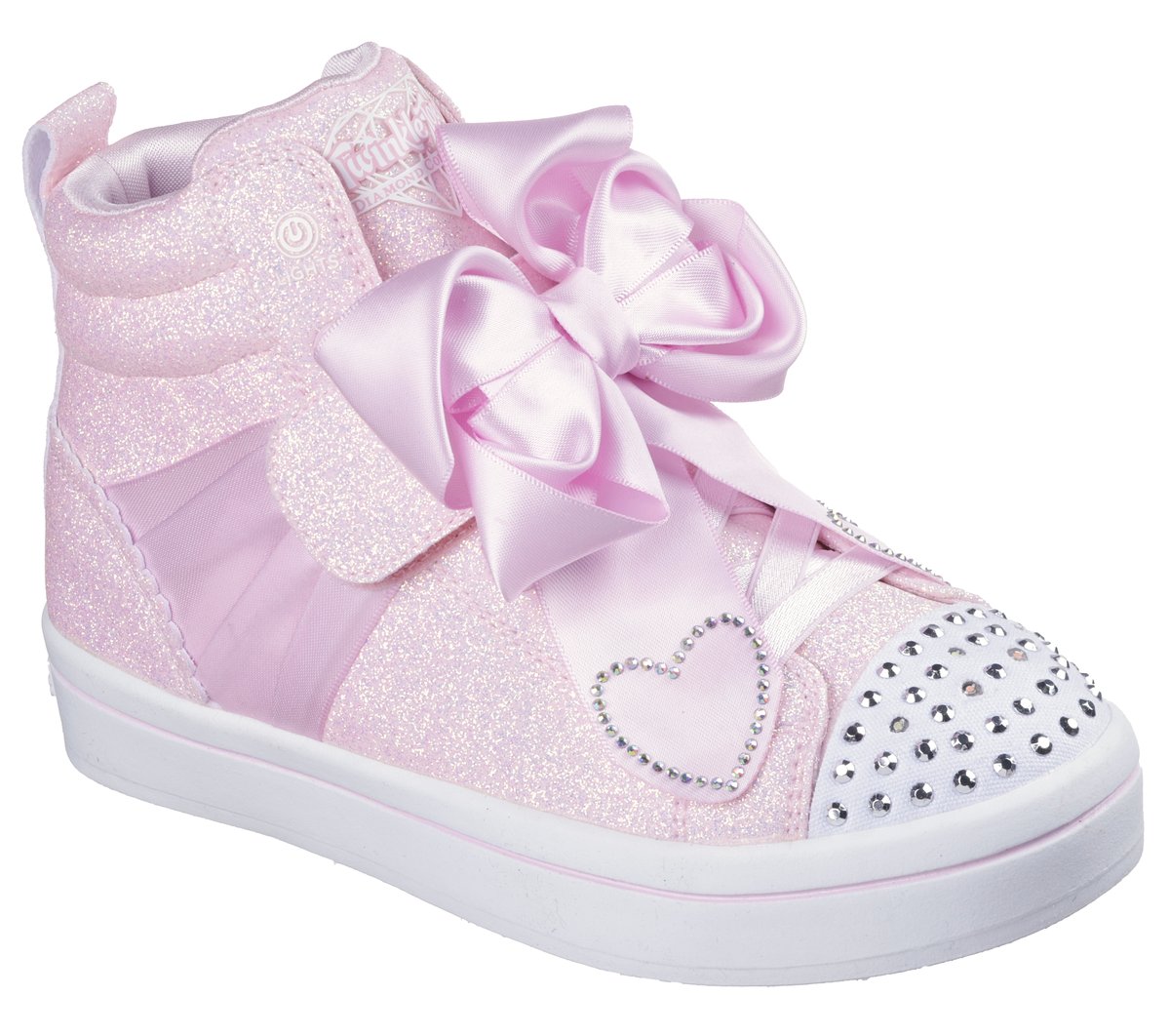 Love abounds in light-up fun with Skechers Twinkle Toes®: Twi-Lites 2.0 – Dreamy Bows. This mid-top Skechers adaptive closure fashion sneaker features a glitter synthetic upper with large satin bow detail, stretch laces, an adjustable instep strap, plus a light-up studded toe cap.