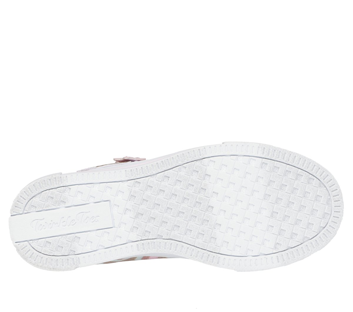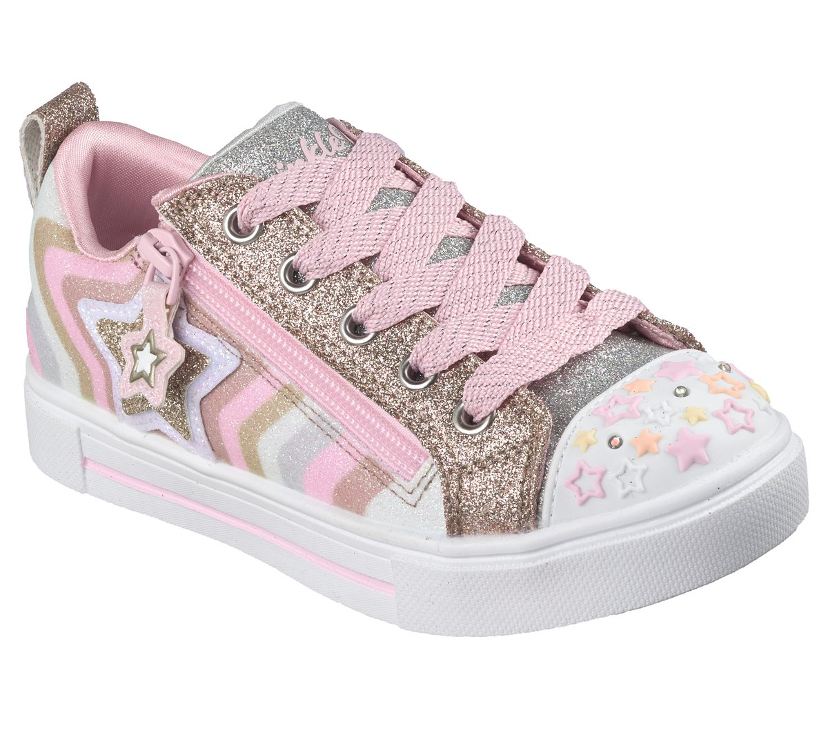 Light up your steps with star-studded style in Skechers Twinkle Toes®: Twinkle Sparks – Cosmic Burst. This lighted sneaker features a synthetic glitter upper with a lace-up front, star design detail, zip-up closure, and an embellished light-up toe cap.