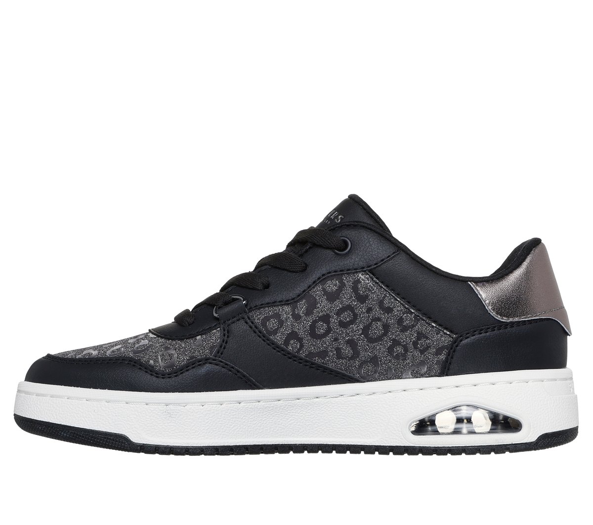 Roam around in spot-on style and cloud-like comfort with Skechers Street™ UNO CTL – Shiny Safari. This court-style fashion design features a lace-up duraleather upper with metallic leopard print underlays, a cushioned Air-Cooled Memory Foam® insole, and a visible Skech-Air® airbag midsole.