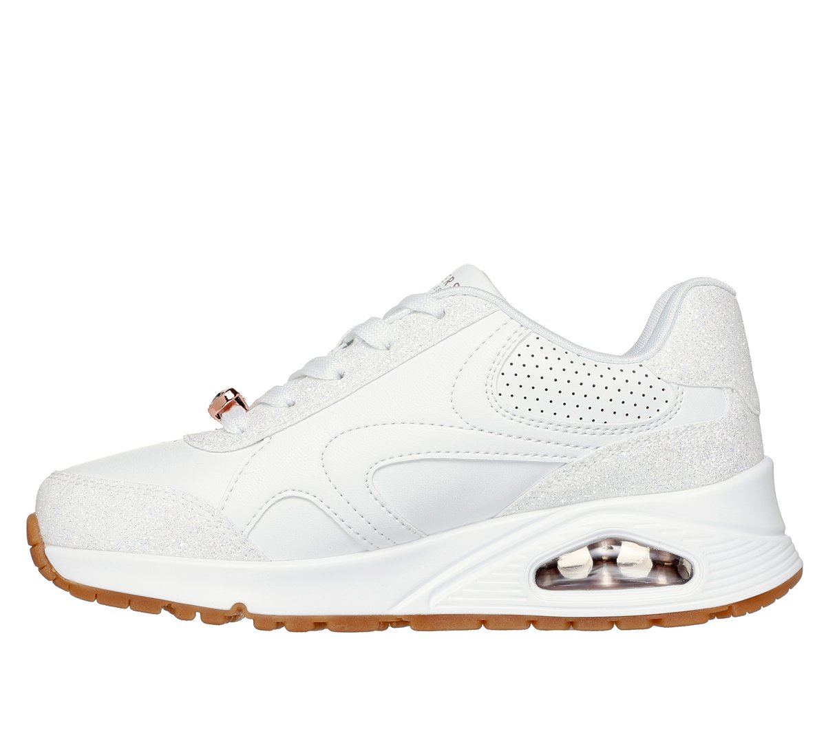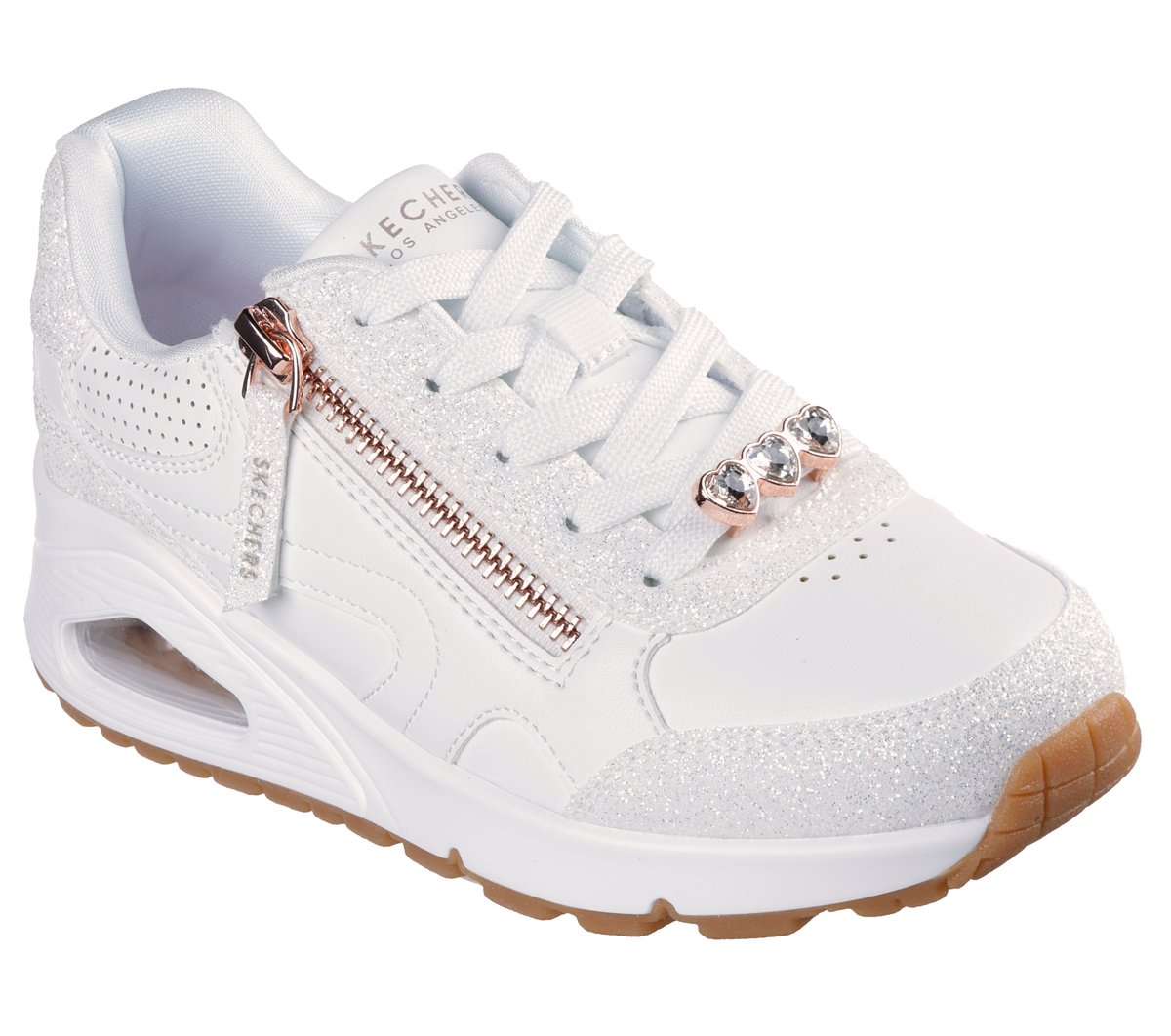 Sparkle with every cushioned step wearing Skechers Street™ UNO Gen1 – Gem Style. This lace-up Skechers adaptive closure design features a synthetic upper with glittery overlays, a quarter zip closure, a Skechers Air-Cooled Memory Foam® comfort insole, and a visible Skech-Air® airbag midsole.