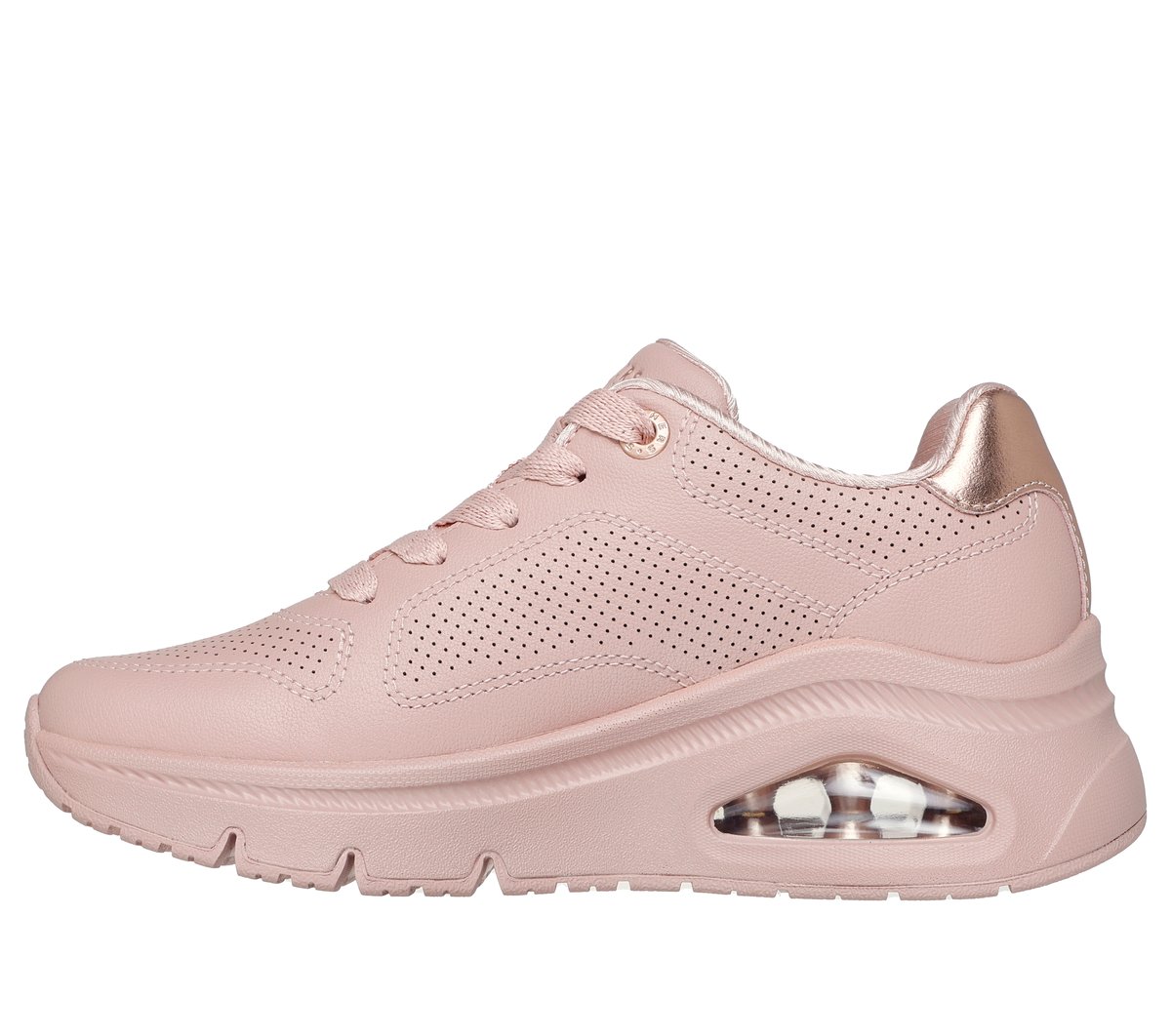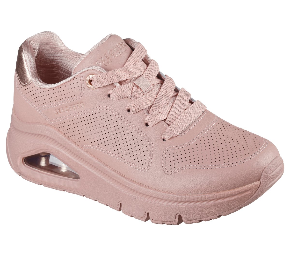 Feel light on your feet in air-cushioned comfort with Skechers Street™ UNO Icon – Idolized Air. This classic lace-up fashion sneaker features a perforated leather upper with metallic color-pop heel mustache, a Skechers Air-Cooled Memory Foam® insole, and a Skech-Air® visible airbag midsole.