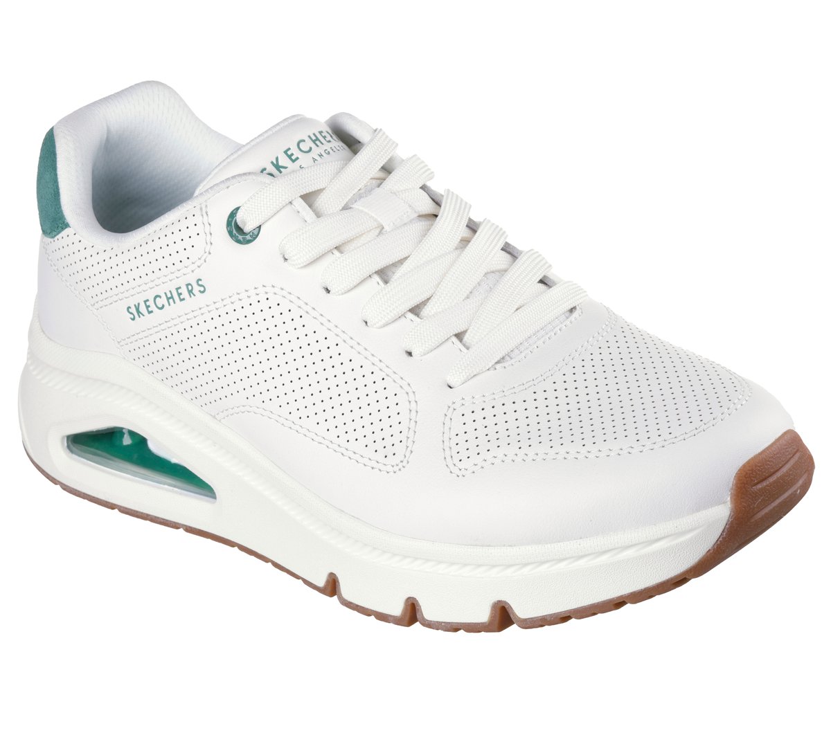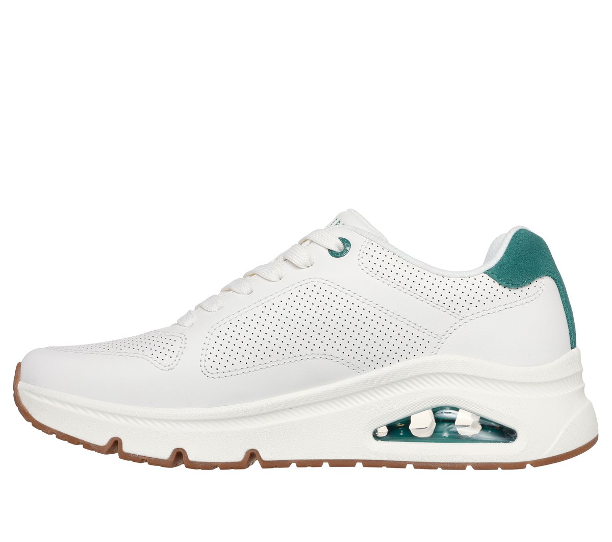 Feel light on your feet in air-cushioned comfort with Skechers Street™ UNO Icon – Idolizer. This lace-up fashion sneaker features a perforated leather upper with a suede color-pop heel mustache, a Skechers Air-Cooled Memory Foam® insole, and a Skech-Air® visible airbag midsole.