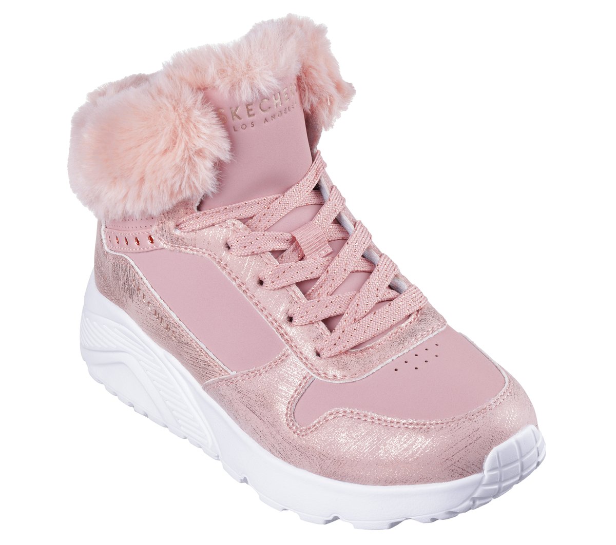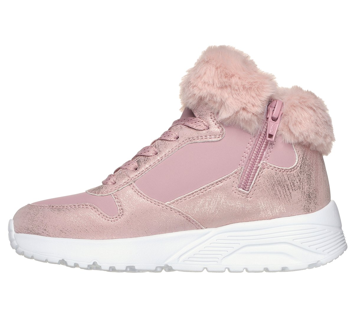 Sporty ‘diva’ style meets cozy comfort in Skechers Street™ UNO Lite – Comfurt Collar. This mid-top fashion sneaker features a durabuck upper with distressed metallic overylays, faux-fur collar trim, side-zipper with Adaptive Closure, and a Skechers Air-Cooled Memory Foam® insole – all on a platform wedge midsole.