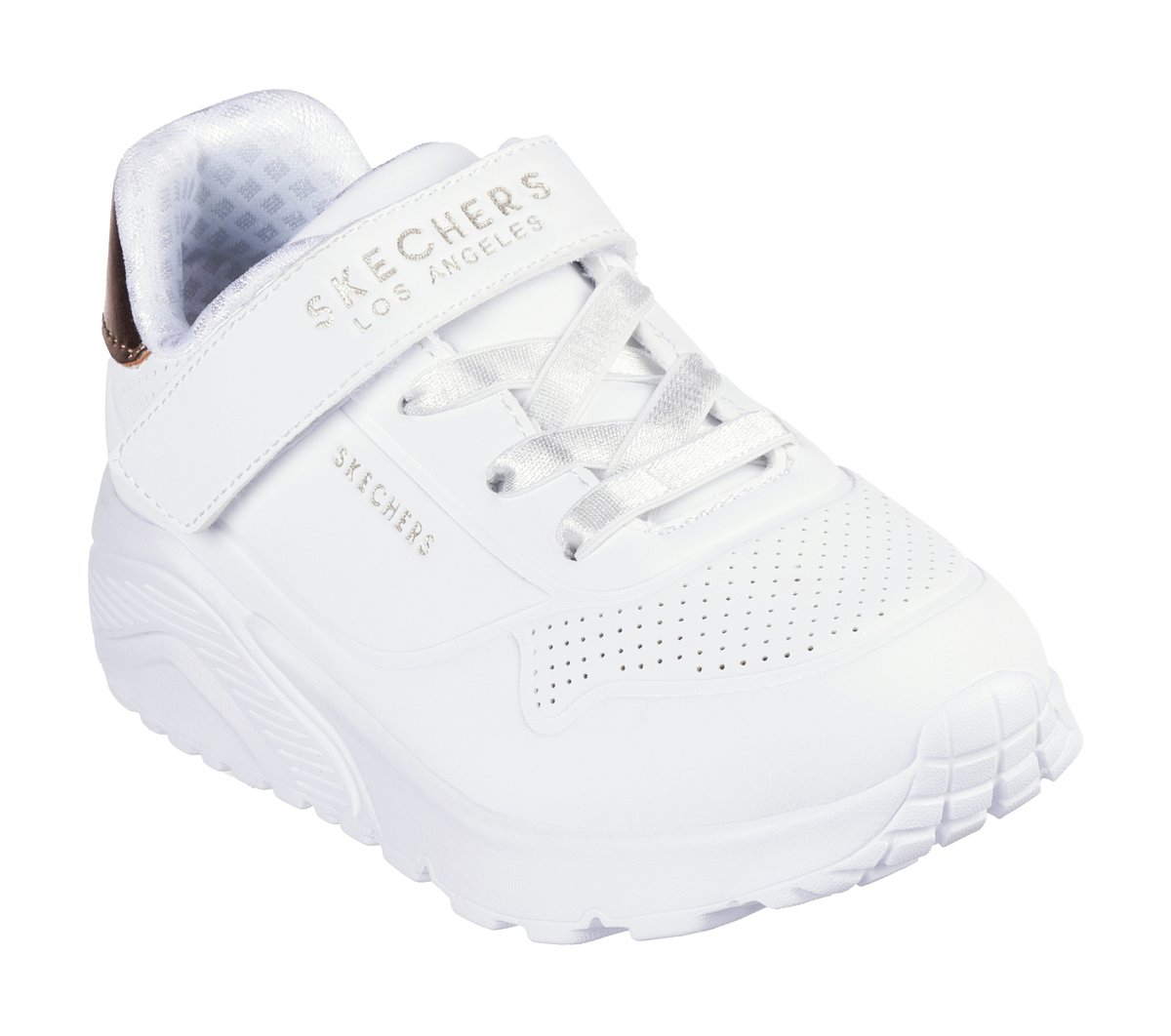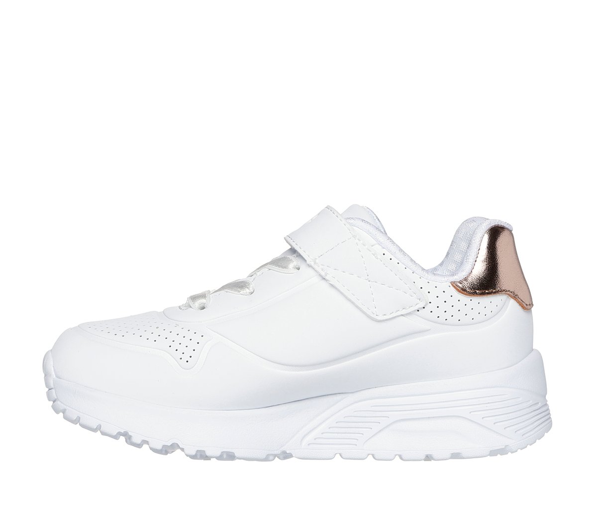 Classic sporty style meets comfort in Skechers Street™ UNO Lite – Precious Shimmer. This fashion sneaker features a smooth durabuck upper with metallic trim, stretch laces, Skechers adaptive closure, cushioned insole, and platform wedge midsole.