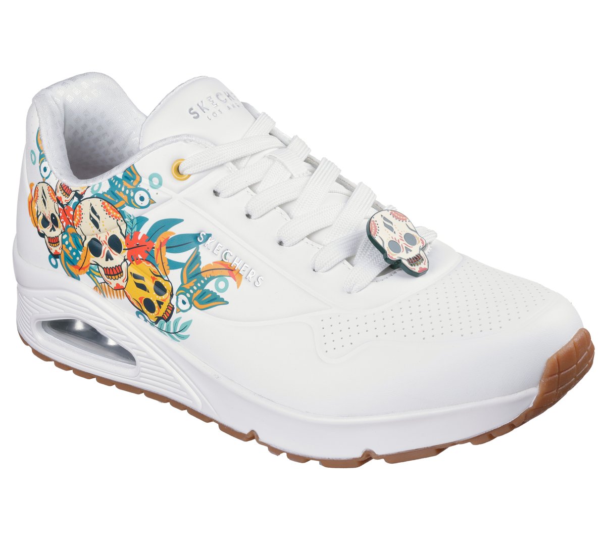 Honor those who live in our memory while celebrating life with the special edition Skechers Street™ Uno – We Are Alive. This fashion lace-up features a vibrant multicolored skull design on a smooth duraleather upper – a tribute to our loved ones and the cultural richness that unites us. Part of the commemorative Día de los Muertos collection, each iconic silhouette blends tradition and comfort with our signature Air-Cooled Memory Foam® cushioning and translucent Skech-Air® midsole.