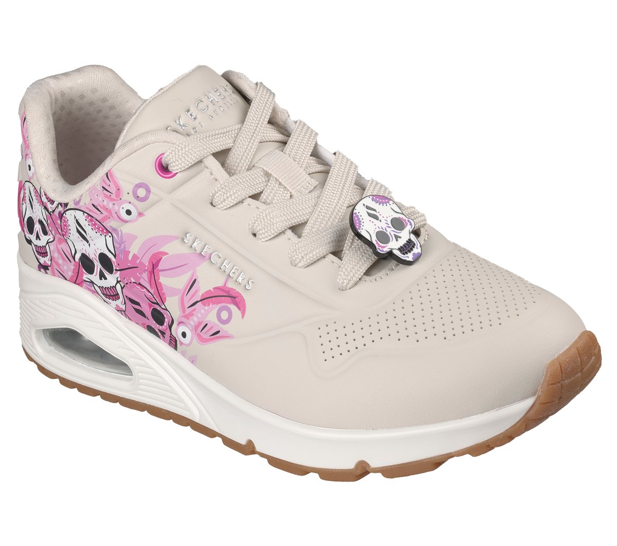 Honor those who live in our memory while celebrating life with the special edition Skechers Street™ UNO – We Are Alive. This fashion lace-up features a vibrant multicolored skull design on a smooth duraleather upper – a tribute to our loved ones and the cultural richness that unites us. Part of the commemorative Día de los Muertos collection, each iconic silhouette blends tradition and comfort with our signature Air-Cooled Memory Foam® cushioning and translucent Skech-Air® midsole.