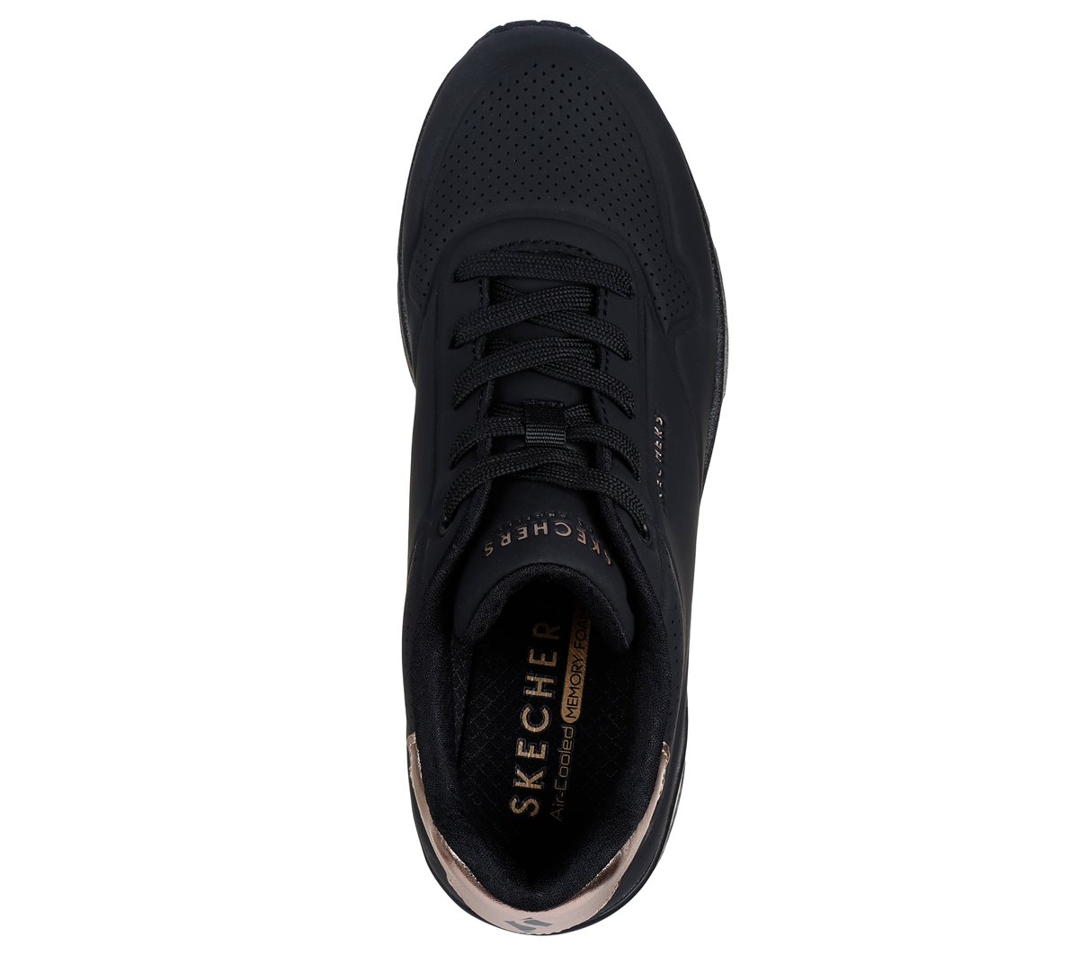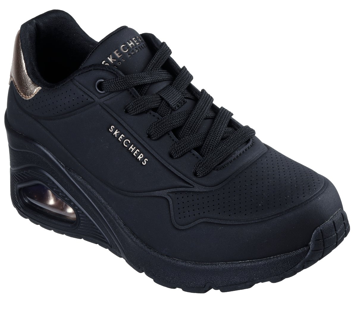 Update your wardrobe with a boost of comfort wearing Skechers Street™ UNO Wedge – HI Steps. This fashion style features a durabuck upper with metallic duraleather trim, Skechers Air-Cooled Memory Foam® insole, and a platform wedge with a visible Skech-Air® air-cushioned midsole.