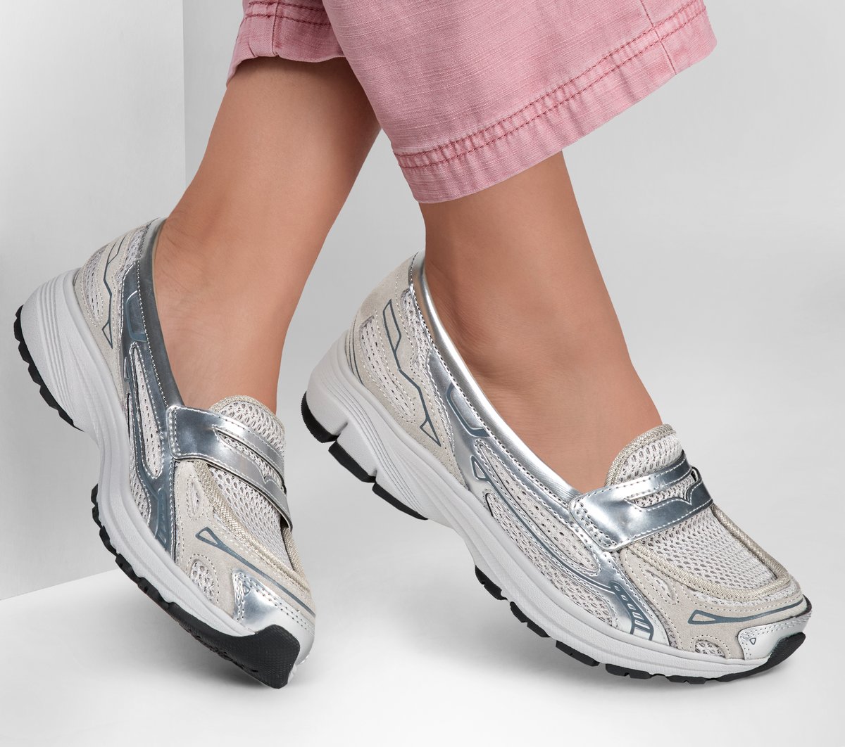 Let your sporty side shine in casual comfort with Skechers Var-City. This easy-on vegan loafer features a mesh and duraleather upper with metallic accents and a Skechers Air-Cooled Memory Foam® insole.