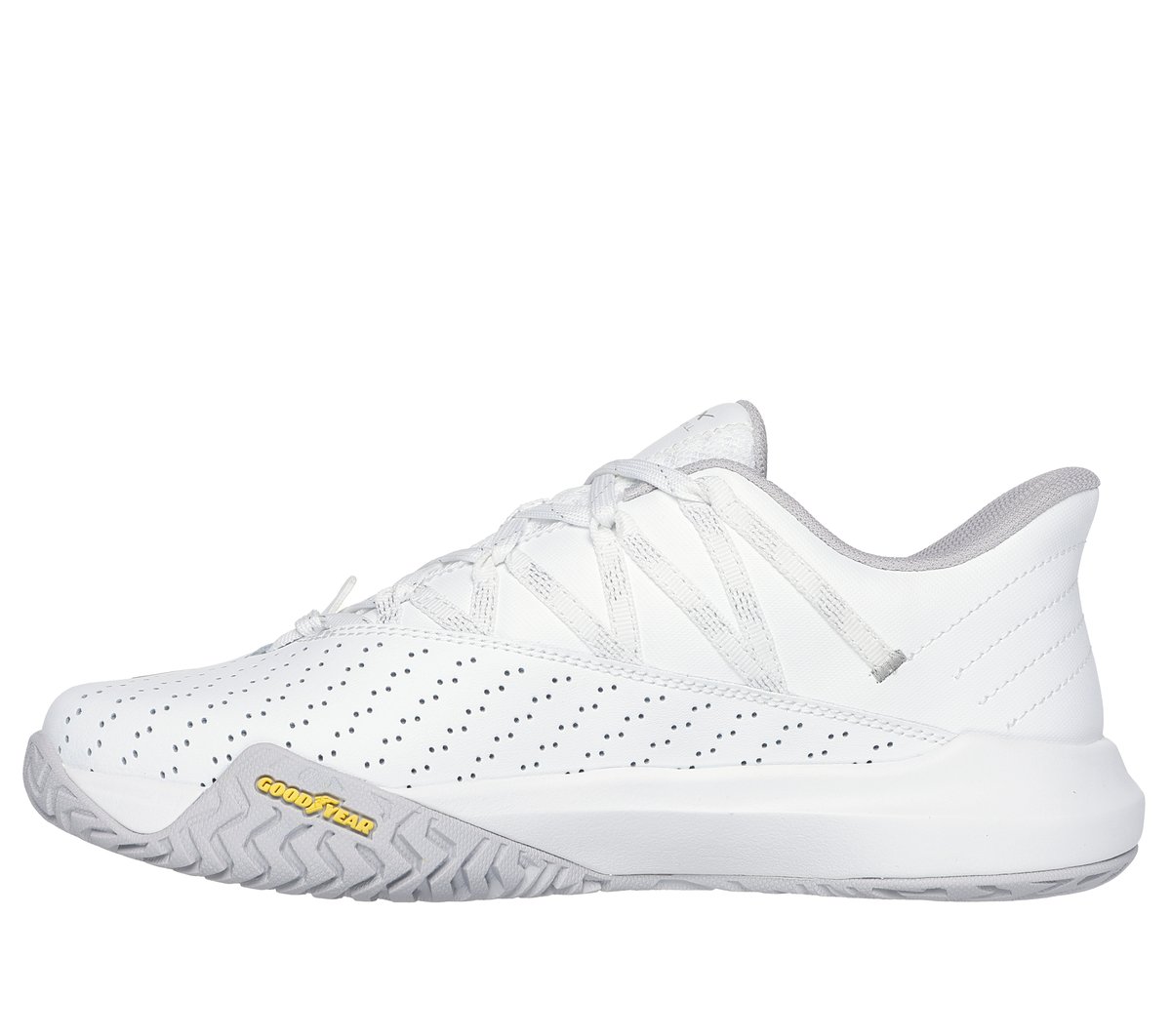 Step up your game with Skechers Viper Court Rally™. This lace-up Pickleball shoe features a mesh and perforated leather overlay upper with a lightweight Move Foam™ insole. The design is complete with a Goodyear® Gold compound outsole that’s built for increased durability to allow the elite player to perform controlled slides specifically on the pickleball court surface.