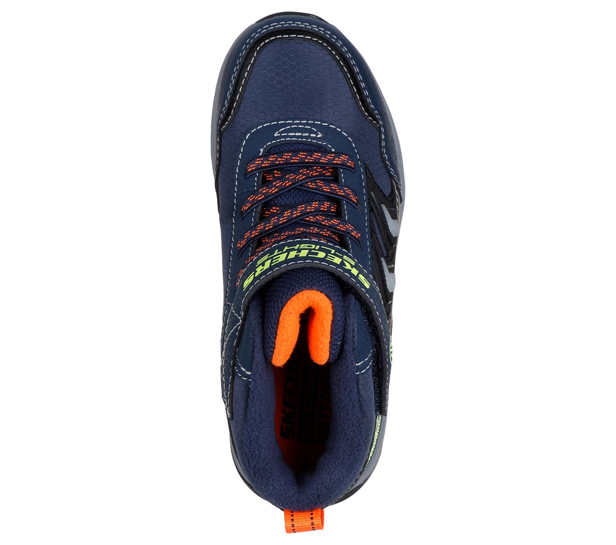 Keep them warm & bright on their outdoor adventures wearing Skechers Storm Blazer – Glow Roam. This waterproof trail sneaker boot features a mesh and faux-leather upper with full fleece lining, stretch laces plus Skechers adaptive closure, light-up quarter panel, and a cushioned comfort insole.