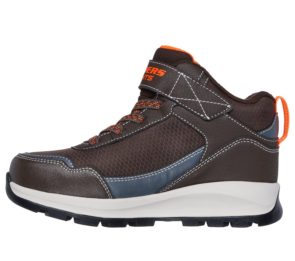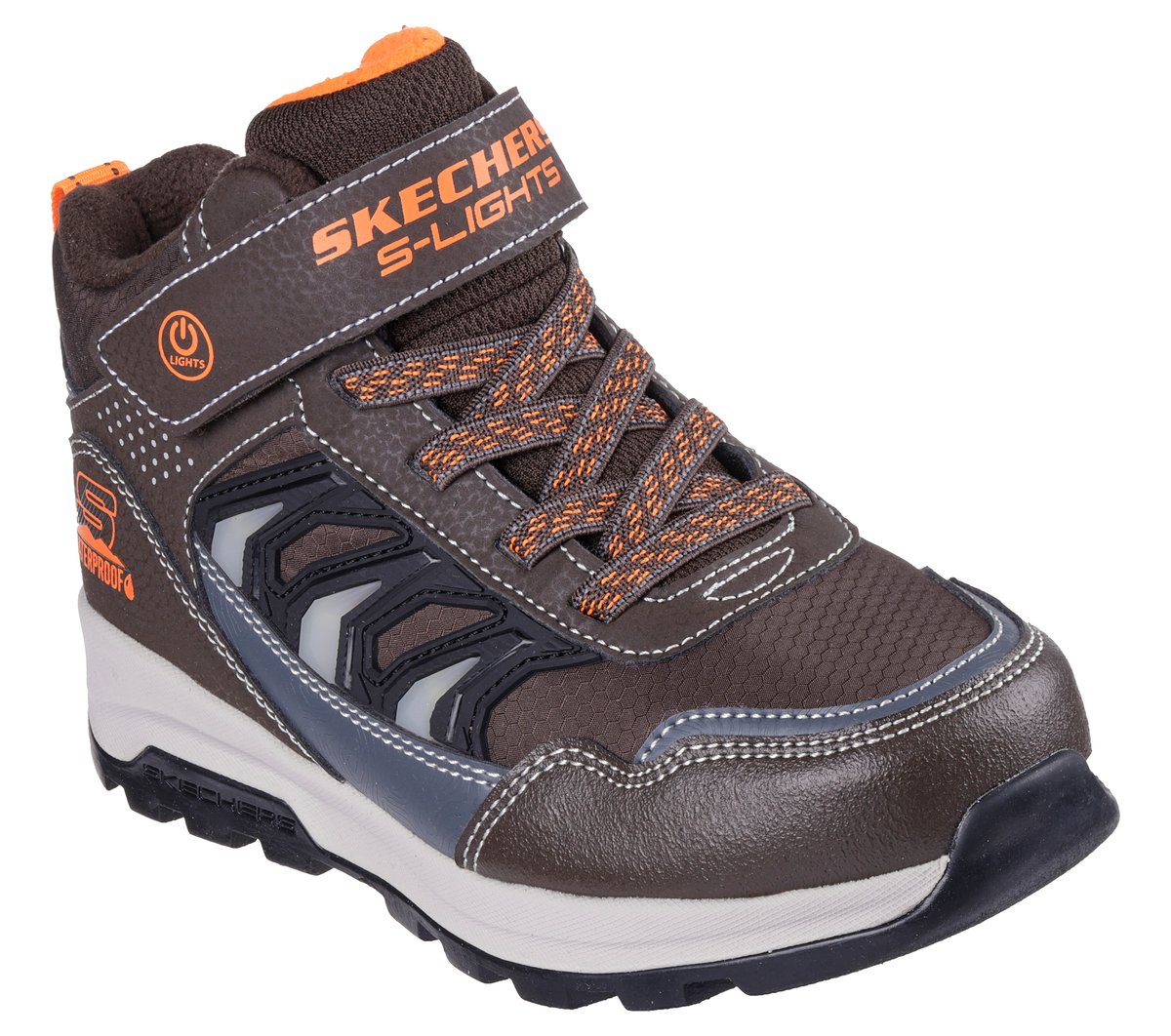 Keep them warm & bright on their outdoor adventures wearing Skechers Storm Blazer – Glow Roam. This waterproof trail sneaker boot features a mesh and faux-leather upper with full fleece lining, stretch laces plus Skechers adaptive closure, light-up quarter panel, and a cushioned comfort insole.
