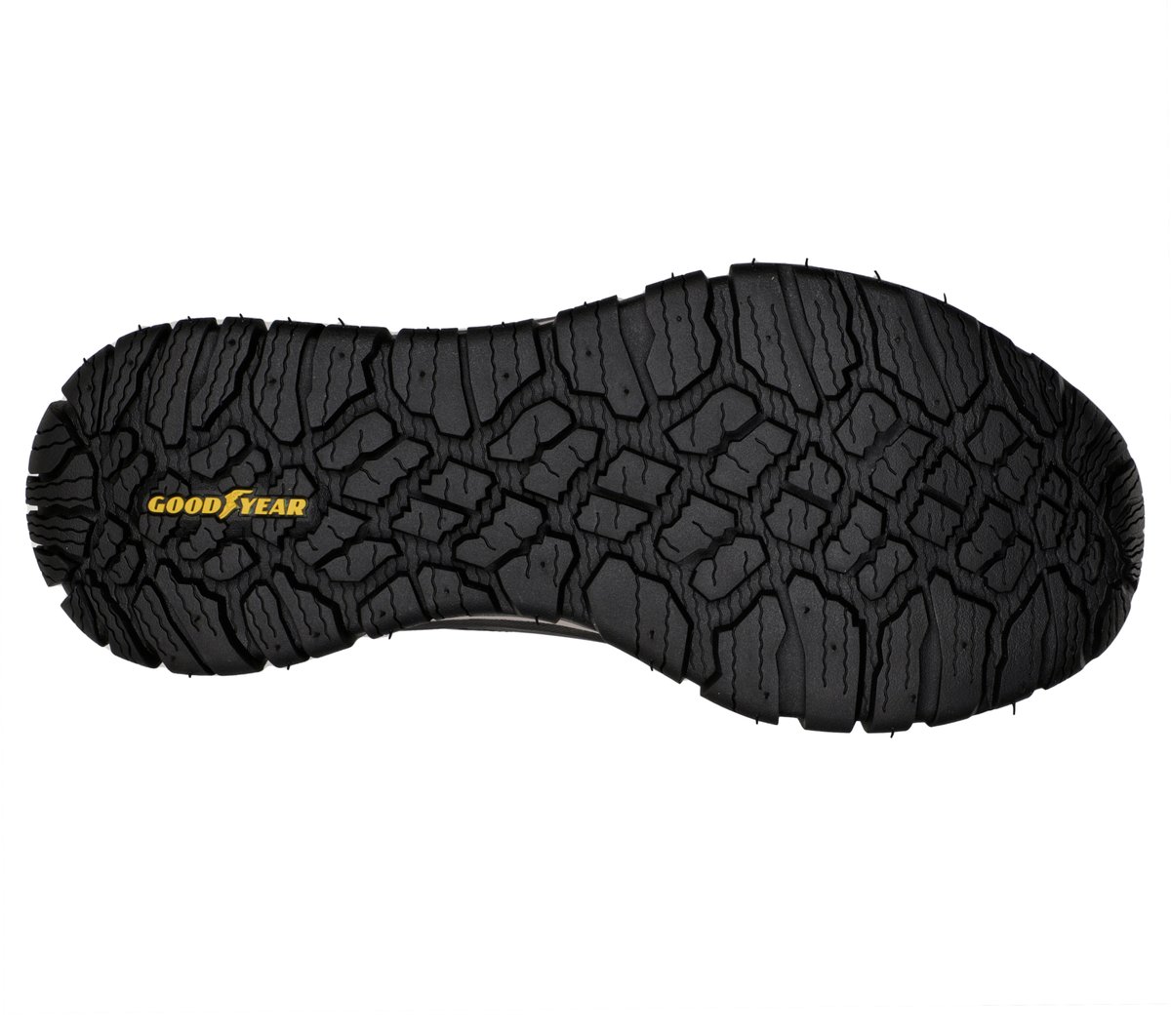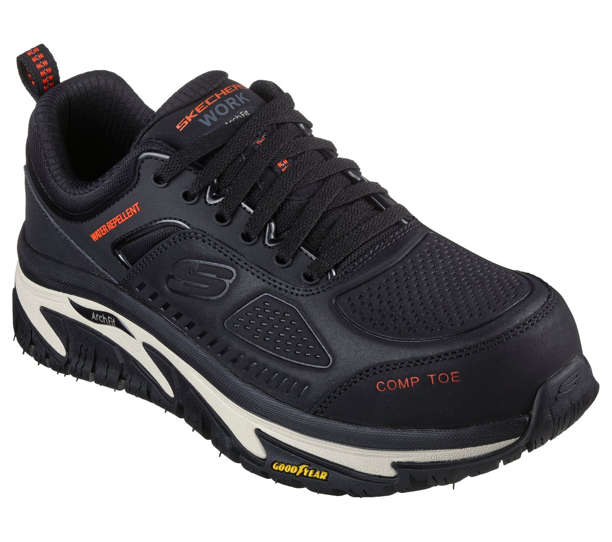 Gear up with all-day support and protection wearing Skechers Work™: Arch Fit® Road Walker – Raylan. This water-repellent style has been granted the APMA Seal of Acceptance and features a 3M® Scotchgard®-treated leather, synthetic and mesh upper with a lace-up front, a nonmetallic composite safety toe, removable Arch Fit® insole, and slip-resistant Goodyear® Performance Outsole.
