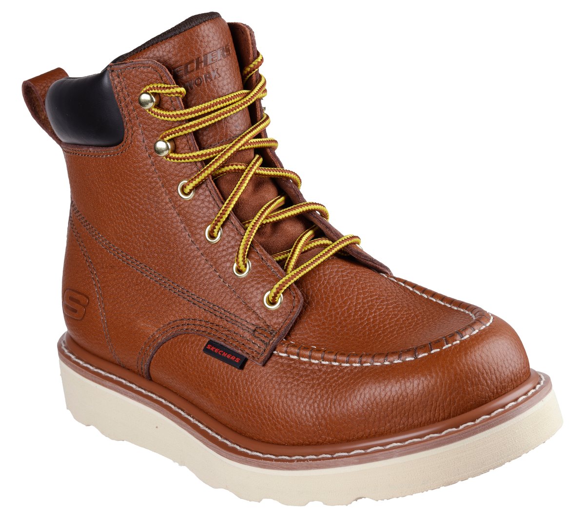 Classic leather work boot style comes to the job site in Skechers Work™: Kadmiel – Bennot. This lace-up work boot features a leather upper with a synthetic padded collar, a cushioned Air-Cooled Memory Foam® insole, and a durable Goodyear welt midsole.