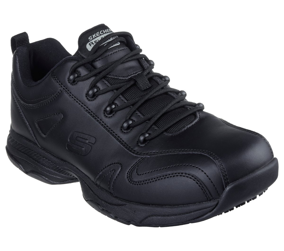 Sporty style, all day safety, and comfort combine wearing Skechers Work™ Relaxed Fit®: Dighton – Strits. This roomy lace-up features a smooth synthetic upper with a Skechers Memory Foam™ insole and slip-resistant outsole.