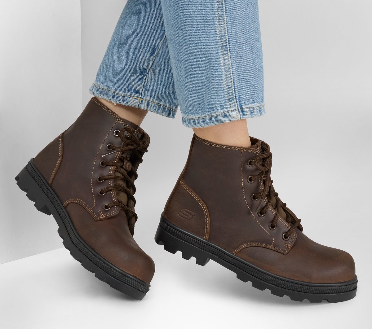 Put safety and dependable comfort first in Skechers Work: Rotund – Finnen. This lace-up utility boot features a leather upper with a non-metallic carbon nano safety toe and a cushioned Skechers Air-Cooled Memory Foam® insole.
